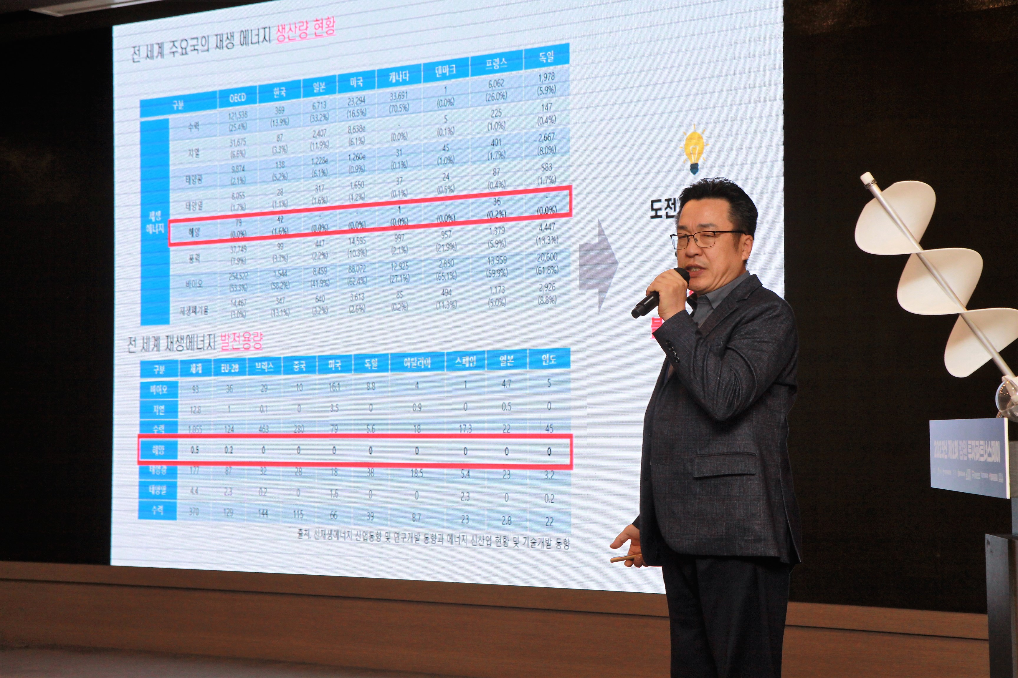 이번 IR발표에서 이목을 끈 공간테크의 경사식 스크류 수력발전은 조류의 흐름 방향에 경사지게 설치하는 스크류형 수차를 가진 조류발전 기술로, 회전축과 구조축을 일체화하여 토목구조물의 비중 및 비용을 절감하고 수차가 받는 유체저항을 최소화하는 한편, 발전효율과 경제적 효용성을 극대화한 기술로서 투자자들에게 소개되었다. 공간테크 정민시 대표는 토목구조물이 없는 조류발전 기술의 상용화 가능성은 99%라고 밝히며 미개척시장인 조류시장에 경사식 스크류 수력발전기술이 개척할 수 있는 범위와 적용방안을 상세히 설명했다.
