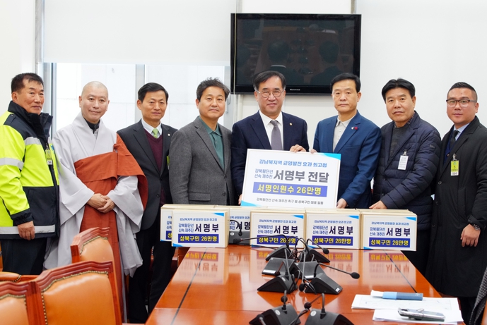 [보도자료]서울 성북구가 26일 중단된 강북횡단선의 신속 재추진에 대한 성북구민의 열망이 담긴 서명부를 국회에 전달했다.이 자리에는 주민대표 5인과 이승로 성북구청장, 김영배 국회의원(더불어민주당, 서울 성북구 갑)이 함께 했다. 국회 국토교통위원회 맹성규 위원장실을 방문한 이들은 강북횡단선 신속 재추진에 대한 성북구민의 열망을 전하고 정부의 관심과 화답을 요청했다.“어린이를 제외하고 거의 모든 성북구민이 지역의 교통 문제 해결과 균형발전에 대한 절박함으로 서명에 동참할 했다”는 주민대표단의 한목소리에 맹성규 위원장은 “국민의 불편을 덜어드리는 게 나라가 하는 일” 이라며 “경제성 비중이 높은 예타 개선을 위한 논의가 필요해 보인다”고 답했다.이승로 성북구청장은 “단기간 성북구민의 60%가 넘는 26만 명이 서명에 동참하신 것은 주민이 실생활에서 가장 체감할 수 있는 교통 문제 해결과 지역 균형발전 추진에 대한 성북구민의 절박함과 강력한 의지를 보여 주신 것으로 서울시에 이어 정부에 호소하기 위해 국회를 방문했다” 면서 “성북구의 미래를 위해 강북횡단선이 반드시 실현될 수 있도록 정부의 관심이 필요하다”고 말했다.김영배 의원 역시 “한 사안에 대해 전체 주민의 60% 이상이 서명에 동참한 사례는 찾기 힘들 것”이라고 강조하면서 “강북횡단선 신속 재추진은 성북구민의 열망뿐 아니라 7개 자치구 주민 모두에게 더 나은 삶을 안기는 사업인 만큼 초당적 협력을 위한 노력을 다각적으로 기울이겠다”고 강조했다.앞서 구는 지난 10월 18일부터 한 달 기간 동안 10만 명을 목표로 ‘강북횡단선 신속 재추진 촉구 범 구민 서명운동’을 진행한 바 있다. 성북구민 비롯해 관내 8개 대학의 관계자와 재학생, 종교단체 등이 팔을 걷고 나서며 채 한 달이 안 되는 기간에 43만 성북구민의 61.5%인 26만 명 동참이라는 결과를 보여 주었다. 구는 지난달 29일 주민대표와 함께 서명부를 서울시에 전달했다.강북횡단선은 서울 동북부와 서남북 간 교통 여건 개선과 지역 균형발전을 위해 반드시 필요한 사업이다. 청량리, 종암, 길음, 정릉, 목동 등 7개 자치구 동서를 관통하는 연장 25.72km의 노선으로 2조 원 규모의 서울시 재정사업으로 계획되었으며 성북구 정릉을 기준으로 청량리 9분, 목동 30분 등 통행시간이 30% 단축되며 정릉역(우이신설선), 길음역(4호선), 종암역(동북선), 월곡역(6호선) 4개 노선과 환승해 그 파급효과가 클 것으로 기대를 모았다.그러나 산악 구간 등을 통과하는 노선 특성상 상대적으로 비용이 많이 투입되는 반면 수요는 적게 예측돼 경제적 타당성이 낮다는 이유로 지난 6월 기획재정부 예비타당성조사 심의에서 미통과 된 바 있다.구는 강북횡단선 재추진 촉구 주민 서명부를 협력 가능한 여러 기관에도 전달하는 한편, 사업의 신속한 추진을 위해 행정력을 집중한다는 계획이다.