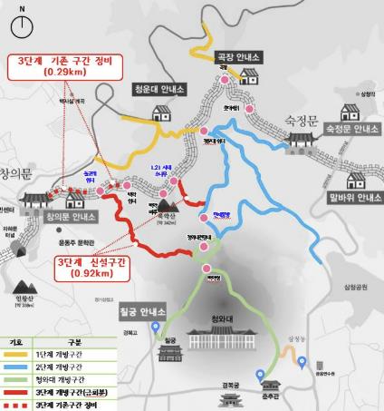 종로구가 9월 준공을 목표로 북악산 문화관광 탐방로 조성을 위한 최종 3단계 사업에 착수한다.‘북악산 문화관광 탐방로 조성’은 명승 제67호 북악산의 수려한 자연경관과 풍부한 문화유산을 시민들이 단절 없이 온전히 경험하는 기회 제공에 중점을 뒀다. 3단계 사업 대상지는 북악산의 마지막 미개방 지역인 남서측 일대다. 이곳의 거대한 바위에는 선조들이 남긴 빼어난 경치를 의미하는 무릉폭(武陵瀑), 도화동천(挑花洞天) 등의 각자(刻字)가 새겨져 있다.종로구는 이번 사업을 통해 총 0.92km 연장의 2개 노선을 신설할 계획이다. 첫 번째 노선은 돌고래쉼터부터 청와대전망대에 이르는 0.68km 구간이고. 두 번째 노선은 1.21소나무에서 시작해 만세동방까지 이어지는 0.24km 구간이다.기존의 군 수색로를 최대한 활용해 북악산의 자연환경을 보존하고, 아름다운 서울의 모습을 충분히 조망할 수 있는 쉼터도 곳곳에 짓는다.낡고 오래된 석축 계단은 내구성이 높은 하드우드 소재의 목재 계단으로 정비한다. 난간 또한 안전기준을 고려하고 심미적인 디자인 요소를 녹여낸 것으로 교체해 걷기 좋은 환경을 만든다.한편 종로구는 지난 2020년 한양도성 밖(북측사면)에서 1단계 사업을, 2021년~2022년 한양도성 안(남측사면)과 백악정 일원에서 2단계 사업을 추진해 탐방로를 신설한 바 있다.3단계 사업의 원활한 추진을 위해 2024년 대통령경호처, 수도방위사령부, 국가유산청과 협의를 마무리 지었으며 2025년 2월 국비, 시비를 포함한 총 사업비 37억을 확보했다. 3단계 사업까지 완료되면 북악산 전 구간이 연결되는 만큼, 종로구의 관광 자원이 한층 풍성해질 것으로 기대된다.정문헌 구청장은 “수십 년간 일반인 출입이 통제됐던 비밀의 숲 ‘북악산’에 대한 시민들의 기대와 호기심에 부응하기 위해 올해 9월 공개를 목표로 사업을 속도감 있게 추진하겠다”라고 밝혔다.