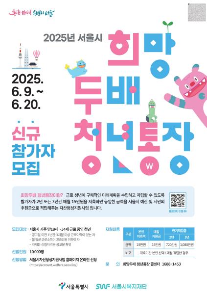 중랑구가 청년들의 자산 형성을 돕기 위해 ‘2025 희망두배 청년통장’ 참여자를 오는 6월 20일까지 모집한다. 희망두배 청년통장’은 일하는 청년들이 안정적이고 구체적인 미래 계획을 수립할 수 있도록 자산 형성을 돕는 지원사업이다. 최대 3년간 매월 15만 원을 저축하면 만기 후 최대 1,080만 원에 이자까지 더해 돌려받을 수 있어 매년 청년들의 큰 호응을 얻고 있다. 신청 대상은 공고일 현재 중랑구에 주민등록이 되어 있고, 만 18세 이상 만 34세 이하인 근로 청년이다. 자격 요건으로는 ▲세전 월 소득 255만 원 이하 ▲부양의무자(부모 또는 배우자)의 연 소득 1억 원 미만 ▲가구 재산 9억 원 미만 등이 있으며, 공고일 기준 최근 1년 이내 3개월 이상 근로한 경력이 있어야 신청할 수 있다. 모집 인원은 서울시 전체 기준 1만 명이며, 접수는 서울시 자산형성지원사업 누리집을 통해 온라인으로 진행된다. 최종 선발 결과는 오는 11월 4일 중랑구청 및 서울시복지재단 홈페이지에 게시될 예정이다. 류경기 중랑구청장은 “희망두배 청년통장 사업을 통해 중랑의 청년들이 미래를 위한 자금도 두 배로 모으고, 꿈도 두 배로 키울 수 있길 바란다”라며 “앞으로도 중랑구의 미래를 이끌 청년들에게 든든한 버팀목이 될 수 있도록 다양한 지원 정책을 마련하기 위해 노력하겠다”라고 말했다. 한편, 구는 청년들 간의 소통과 문화 활동을 촉진하고 지역 사회와의 연결을 강화하고자 ‘중랑 청년청’을 지난해 9월 개장하는 등 청년층의 자산 형성과 자립 기반을 강화하기 위한 다양한 정책을 지속적으로 추진하고 있다.