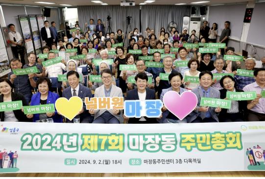 서울 성동구는 6월 13일부터 마을의 다양한 문제를 주민 스스로 발굴하고 해결 방안을 논의하는 ‘2025년 주민자치회 주민총회’를 개최한다.주민총회는 각 동 주민자치회 주관으로 주민이 직접 제안‧발굴한 마을 의제 중 내년도에 실행할 사업을 주민 투표를 통해 결정하는 민주주의 공론의 장이다. 투표는 총회 당일 현장 투표 외에도 찾아가는 사전투표와 온라인 투표를 병행한다.이번 총회는 6월 13일 용답동을 시작으로 7월 11일까지 17개 동에서 순차적으로 진행될 예정으로, 특히 올해는 17개 전 동에서 온라인 사전투표를 실시해 더 많은 주민의 참여를 이끌 계획이다. 총회에는 거주 중인 주민을 비롯해 해당 동에 소재한 사업장, 단체 등 관내에서 생활하고 있는 누구나 참여할 수 있다.돌봄, 기후, 문화, 안전 등 다양한 분야에서 발굴된 103건의 생활밀착형 의제에 대한 투표를 진행하며, 모든 의제는 동별 주민자치회와 주민들이 함께 논의한 결과물로 지역의 특성과 주민의 체감도를 반영해 사업의 실효성을 높였다.총회 당일에는 마을 의제 선정을 위한 공론의 장이 펼쳐지는 한편, 자치회관 동아리 공연, 플리마켓 등 주민은 물론 근처 직장인 등이 함께 즐길 수 있는 다양한 이벤트도 펼쳐진다. 대표적으로 어르신과 취약계층 돌봄을 주제로 한 `생생(生生)한 우리 가정`, `어르신과 오손도손`, `희망 찬(餐) 배달부`, `마음 온도 1℃ 올리기` 등을 비롯해, `탄소중립 친환경 세제 만들기` 등 기후·환경 대응형 의제, 1인 가구 및 반려인을 위한 `우리동네 정리왕은 나야 나~!`, `반려동물과 함께하는 특별한 순간`, 그리고 `대현산 장미 축제`, `송정 벚꽃 축제`, 각종 어울림·한마당 축제 등 문화·여가형 의제까지 고르게 포함됐다.지난해 주민총회에서는 취약계층에 제철음식을 나누는 ‘행복한 나눔찬`, `모락모락 행복한 밥상’을 비롯해 기후 온난화 시기에 맞춘 환경을 살리는 방법을 고민하고 실천하는 ‘함께 놀자! 지구야~’와 ‘응봉지구지킴이`, 마을 명소인 장미공원과 매봉산, 송정동 뚝방길 등을 활용한 다양한 마을 축제를 포함하여 총 98개 사업이 선정돼, 현재 차질 없이 추진 중이다.정원오 성동구청장은 “주민총회는 동네의 작은 불편부터 기후 위기에 이르기ᄁᆞ지까지 주민 스스로 답을 찾고 실현하는 가장 실질적인 참여 플랫폼”이라며, “앞으로 주민들에게 꼭 필요한 사업이 차질 없이 추진 되어 모두가 체감할 수 있는 긍정적인 변화를 이끌 수 있도록 행정적, 재정적 지원을 아끼지 않겠다˝라고 밝혔다.