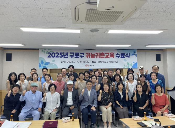 구로구가 7일 구청 신관 평생학습관에서 ‘2025년 귀농·귀촌교육’ 수료식을 개최했다.구는 귀농·귀촌을 희망하는 구민을 대상으로 안정적으로 농촌에 정착할 수 있도록 귀농·귀촌에 필요한 정부 정책, 지원사업 등 각종 정보와 기초 소양을 기를 수 있는 다양한 교육 프로그램을 운영했다.이번 교육과정은 지난 4월부터 7월까지 3개월 동안(총 18회, 50시간) △이론강의(13회) △현장실습(4회) △귀농·귀촌 체험학습(1회) 등 기초교육과 체험 프로그램이 진행됐으며, 총 45명의 수강생 중 39명이 수료했다.이날 수료식에는 구로구청 기획경제국장이 참석해 교육을 수료한 36명의 수강생에게 수료증을 수여하고 축하 인사를 전했다.행사는 수료식 개회, 교육과정 사진 감상, 수료증 수여, 축사, 사진 촬영, 종합 토의 순으로 진행됐다.수료식에 참여한 한 수강생은 “교육을 통해 막막했던 귀농 생활에 대한 구체적인 방향과 자신감을 얻었다”고 전했다.구는 이번 교육 수료를 계기로 귀농·귀촌에 대한 구민들의 관심과 참여가 더욱 확산되길 기대하고 있다.장인홍 구로구청장은 “이번 교육과정에서 얻은 지식과 경험이 농촌 정착에 실질적인 도움이 되길 바란다”며 “앞으로도 귀농·귀촌을 위한 다양한 프로그램을 마련할 수 있도록 노력하겠다”라고 말했다.