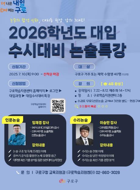 구로구는 지역 내 고등학교 3학년 수험생들의 대입 수시 논술전형 준비를 돕기 위해 ‘2026학년도 대입 수시대비 논술특강’을 운영한다고 밝혔다.이번 특강은 사교육비 부담 경감과 수험생의 논술 역량 강화를 위해 마련됐으며, 7월 22일부터 8월 12일까지 매주 화요일 오후 2시부터 5시까지 총 4회에 걸쳐 구로학습지원센터에서 진행된다.모집 인원은 인문계 20명, 자연계 20명으로 총 40명이며, 인문·자연계로 나누어 수험 전형에 맞춘 맞춤형 강의가 진행된다.인문계 과정은 △논제 분석 △개요 작성 △자료 해석 및 설명 △비판 및 대안 제시 등 논술 작성 기법 중심으로 구성되며, 자연계 과정은 △삼각함수 △적분법 △수학적 귀납법 △조건부 확률 등 수리논술 대비를 위한 문제풀이와 논술 작성 방법을 다룬다. 또한 전 과정에서 1:1 서면·대면 첨삭 지도를 통해 실전 작성 능력 향상도 함께 지원한다.강의는 임재경, 이승만 강사 등 인문·자연계 논술 분야의 경험이 풍부한 전문 강사진이 맡아 최신 출제 경향을 반영한 실전 강의와 맞춤형 피드백을 제공할 예정이다.참여 신청은 7월 10일부터 18일까지 구로학습지원센터 누리집을 통해 온라인으로 접수하며, 수강료는 무료다.자세한 사항은 구로학습지원센터 누리집 또는 구로구 교육지원과로 문의하면 된다.장인홍 구로구청장은 “이번 특강이 수험생들이 대입 논술전형을 체계적으로 준비하는 데 도움이 되길 바란다”며 “앞으로도 청소년 학습 지원을 위한 프로그램을 지속적으로 운영해 교육 기회 확대와 학부모의 교육비 부담 완화에 힘쓰겠다”고 밝혔다.