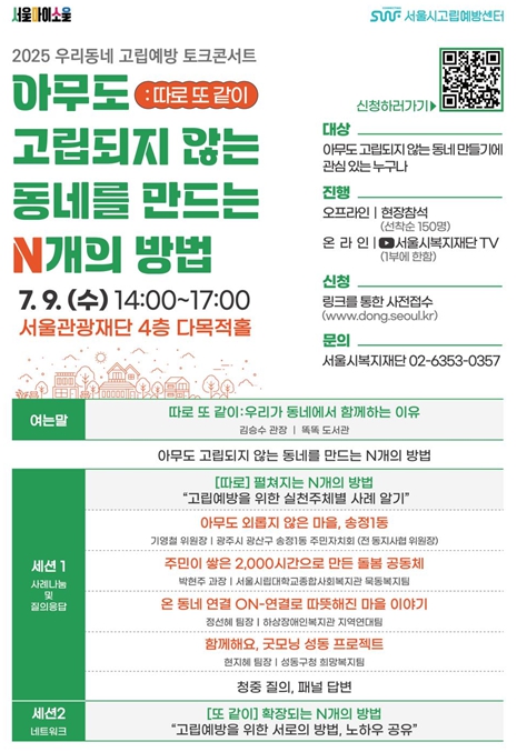 서울시복지재단 내 서울시고립예방센터는 9일 오후 2시 서울관광재단 다목적홀에서 고립 예방을 위한 지역사회의 다양한 실천경험을 나누고 협력방안을 모색하는 ‘우리동네 고립예방 토크콘서트’를 개최한다고 밝혔다. `아무도 고립되지 않는 동네를 만드는 N개의 방법`을 주제로 열리는 이번 토크콘서트는 현장 참가자 120명과 함께 재단 유튜브 채널로 생중계되어 사회적 고립에 관심 있는 시민이면 누구나 시청할 수 있다. 토크콘서트는 ‘따로 또 같이, 우리가 동네에서 함께하는 이유’를 주제로 한 김승수 똑똑도서관 관장의 기조강연으로 시작한다. 김승수 관장은 지역의 다양한 기관들이 각자의 방법으로 고립에 대응하는 이유와 실천 방법은 다르지만 ‘고립 없는 동네’를 위해 함께 움직여야 한다는 공통의 목표에 대해 이야기할 예정이다. 이어지는 사례공유 세션에서는 고립예방을 위한 지역 내 생생한 실천사례들이 소개된다. 광주시 광산구 송정1동 주민자치회 기영철 위원장 ‘아무도 외롭지 않은 마을, 송정 1동’, 서울시립대종합사회복지관 묵동복지팀 박현주 과장 ‘주민이 쌓은 2,000시간으로 만든 돌봄공동체’, 하상장애인복지관 정선혜 지역연대팀장 ‘온 동네 연결 ON-연결로 따뜻해진 마을 이야기’, 성동구청 현지혜 희망복지팀장 ‘함께해요, 굿모닝 성동 프로젝트’ 등 고립예방을 위한 다양한 실천경험을 나눈다. 마지막 세션에서는 참가자들이 자유롭게 고립예방을 위한 서로의 방법을 나누는 네트워크 시간을 통해 고립가구 지원을 위한 지역 내 노하우가 공유되고 확장되는 계기가 될 것으로 기대된다. 이수진 서울시복지재단 서울시고립예방센터장은 “이번 콘서트는 고립을 예방하는 일상의 아이디어와 경험을 누구나 공유하고 배울 수 있는 장”이라며, “고립 문제를 해결하려는 다양한 주체들이 서로 연결될 수 있도록 매년 시리즈로 추진할 계획이다.”라고 말했다.