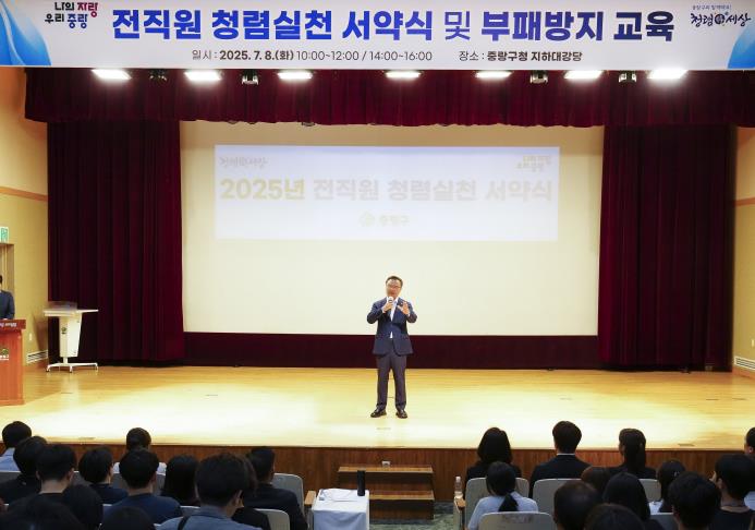 중랑구가 지난 7월 8일, 공직사회의 청렴문화 정착과 내부통제 강화를 위해 전 직원을 대상으로 청렴실천 서약식과 부패방지 교육을 실시했다.이번 행사는 중랑구청 지하대강당에서 오전과 오후 2차례에 걸쳐 진행됐으며, 전 직원이 참여한 가운데 청렴실천 서약과 함께 청탁금지법·이해충돌방지법 등 청렴 관련 법령 및 행동강령에 대한 교육이 이뤄졌다.청렴실천 서약서에는 ▲신뢰받는 내부통제체계 구축 ▲적극행정 실현 ▲청탁금지법 및 이해충돌방지법 준수 ▲청렴한 공직문화 조성을 위한 전 직원의 자발적 노력 등이 담겼다. 또한 2024~2025년 신규 임용 공무원이 대표로 청렴서약서를 낭독해 청렴 실천 의지를 표명했고, 교육에는 국민권익위원회 청렴연수원 전문강사인 한유나 강사가 참여해 실무 중심의 사례교육을 진행하며 큰 공감을 얻었다.류경기 중랑구청장은 “청렴은 신뢰받는 행정의 출발점”이라며, “공직자 모두가 솔선수범해 청렴한 조직문화를 정착시키고 구민에게 신뢰받는 중랑구를 만들어가겠다”라고 말했다.한편, 구는 청렴도 제고를 위한 제도적 기반도 지속적으로 강화하고 있다. 올해 7월 1일자로 청렴정책팀을 신설하고, 기존 정례조례의 명칭을 ‘청렴조례’로 변경하여 청렴 행정에 대한 의지를 제도적으로 드러냈다. 또한 ‘청렴토크콘서트’ 등 다양한 소통 중심 시책도 병행 추진하며 조직 전반에 청렴문화를 확산시키고 있다.이와 같은 내부통제 체계를 바탕으로, 구는 공무원들이 청렴 실천과 책임 있는 적극행정을 안정적으로 수행할 수 있도록 제도적 지원을 이어갈 계획이다. 앞으로도 공직사회 내부의 자율적 점검과 개선을 유도하고, 구민에게 신뢰받는 투명한 행정을 실현하는 기반을 더욱 공고히 해나갈 방침이다.