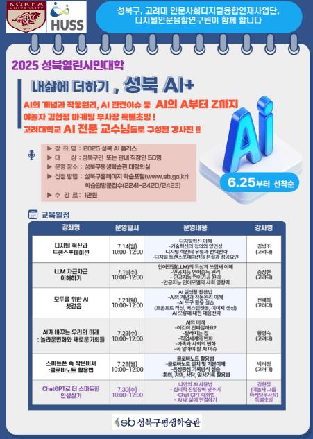 서울 성북구가 구 내 주요 대학들과 협력해 수준 높은 시민교육 프로그램을 제공하면서 지역 평생학습의 새로운 지평을 열고 있다. 2022년부터 운영 중인 ‘성북열린시민대학’은 인문학, 환경학, 사회경제학, 문화예술학, 정보통신(AI), 건강 등 6개 분야에 걸쳐 다양한 시민 강좌를 선보이며 구민의 학습 욕구를 충족시키고 있다.지난 4월부터 6월까지 진행된 2025년 상반기 성북열린시민대학 프로그램은 성공적으로 마무리됐다. 이 기간 동안 총 6개 분야, 36개 강좌에 1,832명이 참여했으며, 참가자 만족도 조사 결과, 전체 응답자의 95% 이상이 프로그램 내용과 강사진에 만족한다고 응답했다. 특히 프로그램 참여를 통해 삶의 질과 행복감이 높아졌다는 응답도 87%에 달해 교육 효과가 확연히 드러났다.성북구는 이달 14일부터 30일까지 고려대학교 디지털인문융합연구원과 공동으로 기획한 ‘성북 AI+’ 특강을 운영한다. 구민 학습수요 설문결과를 적극 반영해 마련된 이번 특강은 인공지능(AI)에 대한 이론과 실제 활용 역량을 동시에 강화할 수 있는 시민 교양 강좌로, 최신 AI 이슈와 실생활 적용 방안을 폭넓게 다룬다.강의는 ▲디지털 혁신과 트랜스포메이션(김병조) ▲LMM 차근차근 이해하기(송상헌) ▲모두를 위한 AI 첫걸음(전태희) ▲AI가 바꾸는 우리의 미래(황영숙) ▲스마트폰 속 작은비서 클로바노트(박려정) ▲chatGPT로 더 스마트한 인생살기(김현정) 등 총 6회에 걸쳐 진행된다. 특히 야놀자 김현정 마케팅 부사장이 실무 중심의 AI 활용 사례를 직접 소개할 예정이며, 고려대학교 교수진이 참여해 강의의 전문성과 신뢰도를 높였다.이번 강좌는 성북구 평생학습관 대강의실에서 성북구민 및 관내 직장인 70명을 대상으로 진행될 예정이다.이승로 성북구청장은 “내 삶에 더하기, 성북AI+ 강좌는 변화하는 디지털 환경 속에서 구민들이 효과적으로 적응할 수 있도록 마련된 프로그램“이라며 “성북구의 자랑인 고려대의 풍부한 교육 콘텐츠와 함께 앞으로도 흥미로운 주제의 학습 현장을 지속적으로 마련하겠다”고 밝혔다.성북구는 이번 ‘성북AI+’ 강좌 외에도 하반기 경제, 건강, 예술, 자기계발 등 다양한 주제의 강좌를 운영할 예정이며, 8월에는 ‘성북VITA+(건강)’, 9~10월에는 동덕여자대학교 RISE센터와 협력한 ’웰에이징크리에이터 과정‘, 11월에는 ’성북청춘학(저속노화)‘을 순차적으로 개설한다.