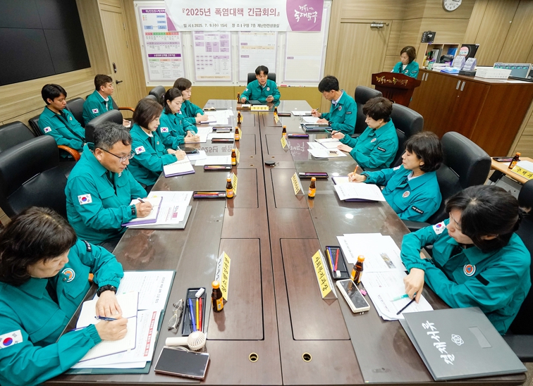 서울 동대문구는 최근 발효된 폭염경보에 선제적으로 대응하기 위해 7월 9일 김기현 부구청장 주재로 폭염대책긴급회의를 개최했다.이날 회의에는 건설안전국장, 안전재난과장 등 총 14명이 참석했으며 급격한 기온 상승으로 인한 인명 및 재산 피해를 최소화하고 부서별 폭염 대책 추진 상황을 점검·강화하기 위해 마련됐다.김기현 부구청장은 부서별 추진 현황을 보고받은 뒤 “폭염 상황이 매우 심각한 만큼 주민들이 체감할 수 있는 실질적이고 효과적인 대응이 중요하다.”라며 각 부서에 실효성 있는 대책 마련을 강력히 주문했다.특히 어르신 등 폭염 취약계층 보호 활동 강화, 관내 등산로·산책로에서의 온열질환 예방 홍보, 무더위쉼터의 효율적 운영, 쿨링포그·생수 냉장고 등 폭염저감시설의 신속한 설치와 가동, 야외 현장근무자의 충분한 휴식시간 보장 등을 철저히 이행할 것을 당부했다.아울러 “주민의 생명과 건강을 지키는 것이 최우선 과제”라며 “현재 시행 중인 폭염 대응 대책을 신속히 추진하고 예산과 물자 지원 등 행정적 뒷받침도 적극 검토하라”고 강조했다.동대문구는 현재 무더위쉼터 70곳, 폭염 방지 그늘막 206개소(고정형 166개소, 스마트형 40개소), 스마트쉼터 14개소, 쿨링포그 8곳을 운영하며 도로 살수 작업도 병행해 폭염 저감에 나서고 있다.특히 구는 주민 이용이 많은 배봉산 산책로 입구와 중랑천변 등 관내 7곳에 ‘더위사냥 힐링냉장고’를 설치해 하루 3회, 총 18만 9000병의 생수를 14일부터 제공한다. 또한 홀몸어르신과 노숙인 등 폭염 취약계층을 대상으로 안부 확인, 냉방물품 지원, 방문 건강관리 등의 보호 대책도 강화하고 있다.