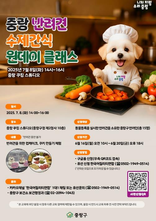중랑구는 오는 8월부터 10월까지 반려인과 비반려인이 함께 공감하며 살아갈 수 있는 건강한 반려문화 조성을 위해 `2025 중랑 반려문화 교실`을 운영한다.이번 교육은 반려동물과의 올바른 관계 형성과 돌봄 역량 향상을 목적으로 ▲반려견·반려묘를 위한 맞춤 식이요법 ▲위생미용 기본 관리법, 반려동물 상실감(펫로스)에 따른 정서적 회복 방법 등 총 3개 과정으로 구성된다. 반려동물 수제간식 교육(클래스)는 8월 23일, 30일, 9월 6일 총 3회에 걸쳐 ‘아틀리에 랑’에서 회차별 10명씩 총 30명을 모집한다. 반려견 간식과 반려묘 간식 만들기 실습이 이뤄지며, 반려동물 미동반 교육이다.위생미용 교육은 9월 19일, 26일, 10월 17일, 24일까지 중앙애견미용학원 면목점에서 총 4회 운영되며, 각 회차 15명씩 총 60명을 모집한다. 반려견 동반이 필수이며, 이론과 실습으로 귀청소, 발톱깎기 등 기본 위생미용을 다룬다.반려동물 상실감(펫로스) 상담 프로그램은 9월 29일 중랑구 사회적경제지원센터에서 1회로 진행되며, ‘펫로스 증후군’을 겪거나 대비하는 주민 15명을 대상으로 한다. 전문 상담사가 증후군의 원인과 증상, 대처 방안을 안내한다.참여자 모집은 8월 1일부터 10일까지 진행되며, 총 105명을 선발한다. 저소득층(기초생활수급자, 차상위계층, 한부모가족)과 65세 이상 1인 어르신 가구에게 우선 기회를 제공할 예정이다. 신청은 홍보 포스터의 큐알(QR)코드를 통한 온라인 접수 또는 `케이케이에이(KKA)한국어질리티연합`의 유선 접수로 가능하다.류경기 중랑구청장은 ˝이번 교육을 통해 반려동물과의 유대감을 높이고 올바른 돌봄 방법을 익히는 계기가 되길 바란다˝라며, ˝반려동물의 죽음으로 심리적 상실감을 겪는 구민들에게 공감과 위로, 그리고 정서적 지지가 되는 시간이 되길 기대한다˝라고 말했다.한편, 중랑구는 지난 7월 1일 서울시 자치구 중 두 번째로 `동물복지과`를 신설하고, 반려문화 정착을 위한 정책을 강화하고 있다. 현재 반려가족 쉼터 3개소를 운영 중이며, 진료비 지원, 행동교정 교육, 문화축제 등 다양한 사업을 통해 반려인과 비반려인의 조화로운 공존을 도모하고 있다.