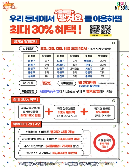 # 직장인 A씨는 퇴근길에 땡겨요에서 2만 원 치킨을 주문하면서 15% 할인된 배달전용상품권을 사용해 실 체감액 17,000원에 결제했다. 여기에 10% 페이백(2,000원)과 5% 적립(1,000원) 혜택까지 더해져 실질 체감가는 14,000원 수준으로 낮아졌다. 게다가 2만 원 이상 주문 2회를 채워 농림축산식품부의 1만 원 소비쿠폰도 받을 수 있어, 다음 주문도 페이백과 소비쿠폰으로 부담 없이 한 끼를 해결할 수 있을 것 같다. 서울시는 공공배달 서비스 ‘서울배달+땡겨요’를 통해 소비자와 가맹점주 모두가 체감할 수 있는 혜택을 대폭 강화한다고 밝혔다. 8일부터 15개 자치구에서 총 143억 원 규모의 ‘배달전용상품권’을 15% 할인된 가격으로 추가 발행하고, 결제 시 ‘10% 페이백’과 ‘5% 땡겨요 포인트 적립’까지 최대 30%에 달하는 할인 효과를 누릴 수 있다. 시는 이 같은 소비자 혜택 강화와 함께 ‘서울배달+가격제’, 자체 배달서비스 ‘땡배달’ 도입 등 다양한 정책을 지속 추진해 ‘서울배달+땡겨요’의 가격 및 서비스 경쟁력을 끌어올리고, 공공배달 시장의 안정적인 안착을 본격화할 계획이다.[8일부터 ‘자치구 배달전용상품권’ 143억 규모 추가 발행… ‘서울페이+’ 앱에서 15% 할인 판매] 먼저, 8월 8일 10시부터 15개 자치구에서 총 143억 원 규모의 ‘배달전용상품권’을 발행한다. 서울페이플러스(서울Pay+) 앱에서 1인당 월 20만 원까지 구매할 수 있으며, 보유 한도는 100만 원이다. (단, 양천구는 월 구매 한도 10만 원) 자치구 배달전용상품권은 각 자치구 내 가맹점에서만 사용 가능한데, 예를 들어, ‘용산구 배달전용상품권’은 용산구 내 가맹점에서만 쓸 수 있다.[15% 상품권 선할인‧10% 페이백‧5% 땡겨요 포인트적립, 최대 30% 할인 적용… 8일부터 예산 소진 시까지] 소비자는 배달전용상품권 또는 서울사랑상품권으로 결제하면 결제금액의 10%를 배달전용상품권으로 돌려받고, 동시에 5% 땡겨요 포인트로 즉시 적립 받는다. 여기에 상품권 자체의 선할인 혜택(15%)까지 더해지면 최대 30%에 달하는 중복 할인 혜택을 받을 수 있다. 페이백은 결제월 기준 익월 20일에 지급되며, 땡겨요 포인트는 주문 완료 시 바로 지급된다. 여기에 농림축산식품부의 공공배달앱 소비쿠폰 지급 기준 완화로 2만 원 이상 음식을 2회 주문하면 1만 원 쿠폰이 예산 소진 시까지 무제한 지급되어 소비자가 체감하는 효과는 더욱 커질 것이라고 덧붙였다. `서울배달+땡겨요`는 ‘구글플레이’, ‘앱스토어’에서 ‘땡겨요’ 앱을 내려받거나 서울페이플러스(서울Pay+) 또는 신한은행 쏠뱅크(SOL뱅크) 앱에서도 연동되어 이용할 수 있다 현재(8.1. 기준) 9개 치킨 브랜드*에서 최대 30% 할인 혜택을 제공하는 ‘서울배달+가격제’에 참여하고 있다. 여기에 지난 21일(월)부터 신청 및 지급되는 민생회복 소비쿠폰을 서울사랑상품권으로 받으면 ‘서울배달+땡겨요’에서 사용할 수 있어, 소비자들은 상품권 할인부터 페이백, 포인트 적립, 소비쿠폰까지 다양한 혜택을 누릴 수 있다.[중개수수료 2%, 광고비 無, 가맹업체당 1억 원 내 저리융자 ‘서울배달상생자금’ 200억 규모 지원] 가맹점주를 위한 혜택도 강화됐다. ‘서울배달+땡겨요’는 중개수수료 2%에 광고료 부담이 없다. 또한 신한은행이 16억 원 보증 재원으로 출연, 가맹점주를 대상으로 업체당 1억 원 이내, 2.0% 이차보전(서울배달상생자금, 200억 규모) 등 직접적인 재정 지원도 병행하고 있다. `서울배달+땡겨요` 입점을 원하는 가맹점은 ‘땡겨요 사장님 라운지’ 누리집 ‘온라인 입점 신청’ 메뉴에서 신청하면 된다. ‘서울배달상생자금’ 신청은 서울신용보증재단 모바일앱 또는 종합지원센터에서 하면된다. 이해선 서울시 민생노동국장은 “공공배달앱이 경쟁력을 갖추기 위해서는 소비자와 가맹점주의 적극적인 참여가 필요하다”며, “서울시는 가맹점주의 경영이익을 높이고, 소비자에게도 다양한 혜택을 제공할 수 있도록 적극 지원하겠다”고 말했다. 이어 “앞으로도 공공배달앱이 소비자와 가맹점주 모두에게 이익이 되는 ‘상생 플랫폼’으로 자리매김할 수 있도록 공공배달 이용 활성화에 총력을 다하겠다”고 강조했다.