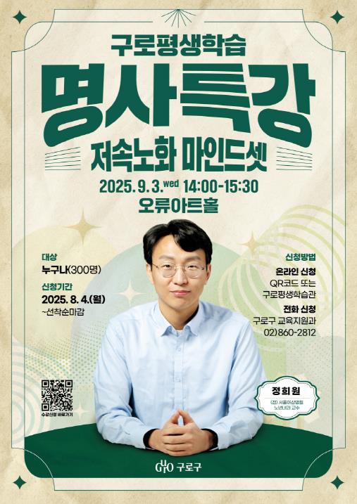 구로구가 9월 3일 오후 2시 오류아트홀에서 정희원 박사의 ‘저속노화 마인드셋’을 주제로 명사 특강을 개최한다.이번 특강은 정희원 박사가 강사로 나서 바쁜 일상 속 내면의 속도를 조절해 건강하고 지속 가능한 노후를 준비하는 ‘저속노화 마인드셋’에 대해 소개할 예정이다.정희원저속노화연구소 소장인 정희원 박사는 ‘유 퀴즈 온 더 블록’, ‘아침마당’, ‘라디오스타’ 등 여러 방송에 출연, ‘저속노화 식사법’, ‘느리게 나이드는 습관’ 등 노화를 늦추는 건강한 습관에 관한 강의와 저서로 크게 주목받고 있다.명사특강은 8월 4일부터 구로구민을 포함한 누구나 구로평생학습관 누리집이나 포스터의 큐알(QR)코드를 통한 온라인 신청 또는 구청 교육지원과로 전화해서 신청하면 된다.모집인원은 총 300명이며, 선착순 마감된다.장인홍 구로구청장은 “이번 특강이 구로구민 여러분이 건강하고 행복한 노후를 준비하는 데 큰 도움이 되길 바란다”며 “앞으로도 주민들의 삶의 질 향상을 위한 다양한 교육 프로그램 제공을 위해 최선을 다하겠다”고 말했다.한편, 구는 사회 각 분야 명사를 초청한 다양한 평생학습 프로그램을 운영하며, 구민 누구나 쉽게 참여할 수 있는 맞춤형 강의를 지속적으로 마련하고 있다.