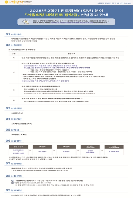 서울장학재단이 2025년 2학기 ‘서울희망 대학진로 장학금’ 진로탐색 분야 장학생 255명을 모집한다. 이번 장학금은 진로를 설계하기 시작한 대학 1학년생이 학업과 미래 준비에 온전히 집중할 수 있도록 마련된 것으로, 교육 기회의 격차를 줄이고 미래 인재로의 성장 기반을 제공하기 위한 장학제도다. 이번 장학금은 서울장학재단이 운영하는 ‘서울희망 대학진로 장학금’ 사업 중 진로탐색 분야로 2025년 2학기에 재학하는 1학년 신입생을 대상으로 한다. 상반기에는 2학년 이상 대학생 800명을 선발해 연간 400만 원을 학업장려금을 지원하고 있다. 전년도에는 총 1,010명에게 총 34억 3,500만 원의 장학금을 지원했다. 올해는 지원 규모를 확대해 총 1,055명을 선발해 총 37억 1,000만 원의 장학금을 지원한다. 선발 대상은 서울 소재 대학에 재학 중인 1학년 2학기 재학생 또는 서울 시민이면서 비서울 소재 대학의 1학년 2학기 재학생이다. 이외에도 성적과 소득 요건 등 지원 자격을 모두 충족해야 신청할 수 있다. 선발인원은 총 255명이며, 선발된 장학생에게는 1인당 200만 원의 학업 장려금이 1회 지급된다. 신청은 8월 5일 오전 10시부터 8월 12일 오후 4시까지 서울장학재단 누리집을 통해 개별로 진행하면 된다. 선발 절차는 1차 사무국 심사, 2차 서류심사, 3차 장학생선정위원회 심의를 거치며, 최종 선정 결과는 9월 30일 발표 예정이다. 일정은 내부 운영 사정에 따라 일부 변경될 수 있다. 남성욱 서울장학재단 이사장은 “진로를 설계해 나가기 시작하는 대학 1학년생이 학업과 미래 준비에 집중할 수 있도록 실질적인 도움을 주기 위해 이번 2학기 장학생 모집을 시작한다”며, “앞으로도 서울의 대학생들이 주도적으로 진로를 탐색하고 학업에 집중할 수 있도록 지속적으로 장학 지원을 이어가겠다”고 밝혔다.