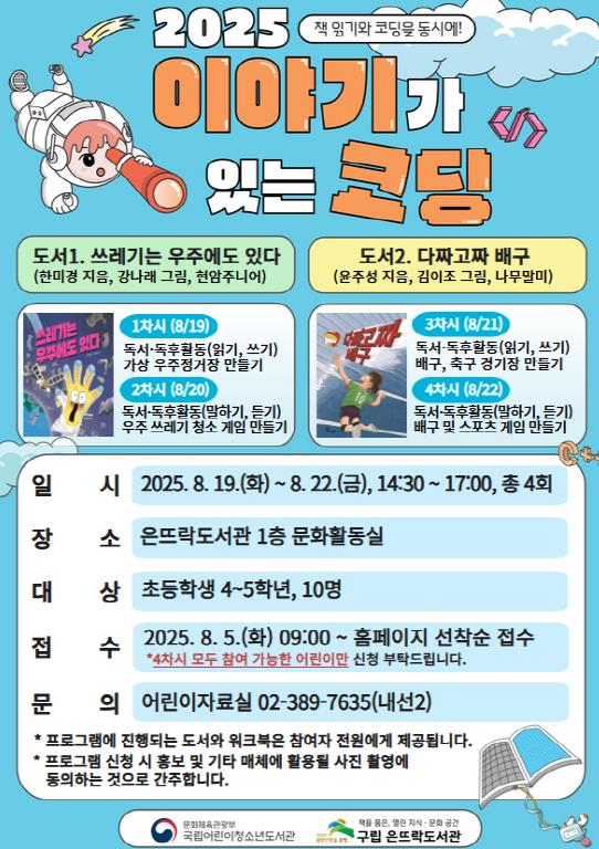 서울 은평구는 구립 은뜨락도서관에서 국립어린이청소년도서관이 주최하는 ’이야기가 있는 코딩‘ 공모사업에 선정돼 초등학생을 대상으로 독서 연계형 코딩 수업을 운영한다고 밝혔다.’이야기가 있는 코딩‘은 독서와 소프트웨어 교육을 결합한 코딩 교육 프로그램으로, 어린이들이 디지털 환경에 능동적으로 대응할 수 있는 역량과 논리적 사고력을 기를 수 있도록 기획됐다.이번 프로그램은 초등학생 4~5학년을 대상으로, 오는 19일부터 22일까지 총 4회차에 걸쳐 도서관 사서의 독후 활동 지도와 전문 코딩 강사의 주제 도서 기반 코딩 수업으로 진행된다.올해의 주제 도서로 선정된 ’쓰레기는 우주에도 있다‘와 ’다짜고짜 배구‘를 읽은 후 3차원 가상 공간을 직접 설계하고 구현함으로 어린이들의 책에 대한 흥미와 창의력 및 문제 해결 능력을 향상시킬 예정이다.교육 과정은 ▲가상 우주정거장 만들기 ▲우주 쓰레기 청소 게임 만들기 ▲배구 및 축구 경기장 만들기 등 코스페이시스를 활용한 프로그래밍 체험으로 준비된다.은뜨락도서관 관계자는 “독서와 연계된 코딩 수업을 통해 어린이들이 책을 가까이 접하는 습관을 형성하고 자신만의 디지털 세계를 표현해 나가는 확장된 독서 경험을 하기 바란다”라고 말했다.