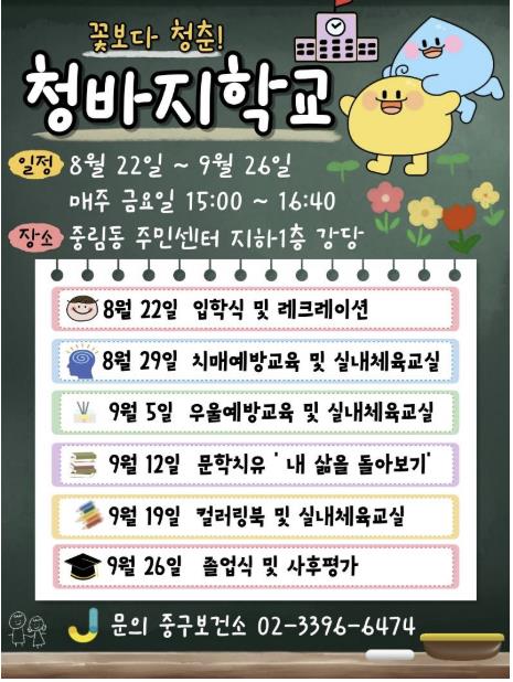 서울 중구가 어르신들의 신체·정신 건강 증진을 위한 대표적인 맞춤형 건강 프로그램인 `청바지학교` 신입생을 이번달 14일까지 모집한다.`청바지학교`는 8월 22일부터 9월 26일까지 총 6주간 매주 금요일마다 중림동주민센터 지하 1층 강당에서 진행된다. 관내 만 65세 이상 어르신 30명을 대상으로 하며, 중림동·회현동·소공동·명동 거주자를 우선 선발한다.‘청춘은 바로 지금부터’라는 이름처럼 노년기에도 활기찬 삶을 응원하기 위해 기획됐다. 입학 선서부터 졸업식까지 전 과정을 학교 형식으로 운영해 어르신들에게 학창 시절의 추억을 떠올리게 하며 매년 높은 만족도를 이끌어내고 있다.동국대학교, 중구치매안심센터, 중구체력인증센터가 함께 하는 `청바지학교`는 자아존중감 향상 레크리에이션을 시작으로, 치매 예방 인지활동, 우울 예방 교육, 근력 강화 운동, 문학치유 프로그램, 컬러링북 활동 등 다채로운 강의가 마련되어 있다. 특히 각 회차마다 신체활동과 정서 지원이 균형 있게 구성되어 있다.또한 프로그램이 종료된 이후에는 졸업생들을 대상으로 건강소모임을 운영하여 지속적인 건강관리와 공동체 활동을 이어나간다. 이 모임을 통해 어르신들은 서로 안부를 주고받으며 응원하고 함께 건강한 생활 습관을 실천해 나가는 따뜻한 공동체를 만들어간다.중구는 청바지학교를 도입한 22년도 32명의 졸업생을 배출한 이후, 25년도 상반기까지 총 435명의 졸업생을 배출했다. `청바지학교`의 인기가 커지며 올해는 중구 15개 동을 3개 권역(12개동)과 3개 동으로 나누어 운영하고 있다.올해 상반기 청바지학교 졸업생(신당5동, 만 86세)은 “시간이 순식간에 지나갔지만, 산전수전 다 겪은 우리들이 함께 웃고 배우며 보낸 순간들이 오래도록 기억에 남을 것 같다”고 말했다.이번 프로그램 참여를 원하는 어르신은 중구보건소를 방문하거나 전화로 신청하면 된다.중구는 10월부터 광희동·장충동·필동·을지로동 어르신을 대상으로 한 청바지학교를 운영할 예정이다.구 관계자는 “어르신 한 분 한 분의 하루가 웃음으로 채워지고, 더 건강하게 빛나도록 진심으로 응원한다”며 “중구의 어르신 맞춤형 건강관리 프로그램인 청바지학교를 통해 활기차고 건강한 일상을 보내시길 바란다”고 전했다.