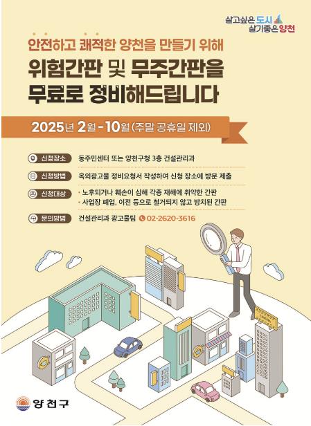양천구는 태풍 시기 강풍에 의한 간판 낙하사고를 예방하기 위해 8월 한 달간 위험간판 집중 정비에 나선다고 7일 밝혔다.이번 조치는 여름철 태풍과 집중호우로 인한 간판 낙하·탈락 사고를 사전에 예방하기 위한 선제적 대응으로, 순찰을 강화하여 위험간판을 발굴하고, 민원이 접수된 추락 위험이 높은 간판은 신속히 정비한다는 계획이다.집중 정비 대상은 ▲노후 ▲고정불량 ▲전기배선 탈락 ▲부식 등의 이상 징후가 있는 간판으로, 필요 시 옥외광고협회와 협조해 긴급 안전점검을 병행하여 ‘위험’ 판정을 받은 간판을 즉시 철거할 예정이다.아울러, 양천구는 노후하거나 훼손이 심한 ‘위험간판’과 주인 없는 ‘무주간판’에 대해 무료 정비사업을 연중 실시하고 있다.특히, 올해부터는 사업기간을 한정하지 않고 연중 상시로 확대 운영하여, 주민이 언제든지 신청할 수 있는 환경을 마련하고, 정비가 필요한 간판에 대해서는 신속한 대응이 가능하도록 개선했다.정비를 희망하는 간판 소유자 또는 간판이 설치된 건물 소유자(또는 관리인)는 ‘신청서’를 작성해 건물 소재지 동주민센터 또는 양천구청 건설관리과에 제출하면 되고, 현장조사 및 위험도 판정을 거쳐 철거 여부가 결정된다.이기재 양천구청장은 “강풍으로 인한 간판 사고는 자칫 큰 인명 피해로 이어질 수 있는 만큼, 철저한 사전 정비가 중요하다”며 “앞으로도 작은 위험이라도 놓치지 않고 선제적으로 대응해, 주민의 생명과 안전을 지키는 데 최선을 다하겠다”고 밝혔다.