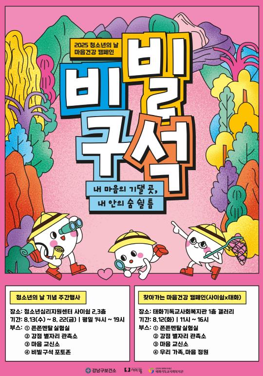 꿈이 모이는 도시, 미래를 그리는 강남구가 ‘국제 청소년의 날’(8월 12일)을 기념해 오는 8월 12일부터 22일까지 ‘비빌 구석’(내 마음의 기댈 곳, 내 안의 숨쉴 틈)이라는 주제로 청소년 마음건강 주간을 운영한다.국제 청소년의 날은 청소년의 권리와 복지 증진을 위해 유엔(UN)이 제정한 날로, 강남구는 올해 이를 맞아 청소년 정신건강 문제에 대한 사회적 공감대를 넓히고, 정서적 회복과 성장을 응원하는 의미 있는 행사를 마련했다.행사의 시작은 8월 12일 태화기독교사회복지관 1층 갤러리에서 진행되는 찾아가는 캠페인이다. 청소년심리지원센터 ‘사이쉼’과 태화기독교사회복지관이 공동 주최하며, ‘나’, ‘타인’, ‘가족’ 이라는 3가지 주제 아래 총 4개의 체험 부스를 운영한다.‘나’를 주제로 하는 ‘쫀쫀멘탈 실험실’에서는 참여자가 자신의 회복탄력성을 진단하고 스트레스 대처 방법을 알아보고 ‘감정 별자리 관측소’는 자신의 강점을 별 스티커에 적어 밤하늘 별자리를 완성하며 자기 인식을 높이는 체험이다.‘타인’ 영역의 ‘마음 교신소’ 부스에서는 친구나 이웃에게 응원의 글을 쓰고, 다른 사람의 메시지를 받아보며 공감 능력을 키운다.‘가족’을 주제로 한 ‘우리 가족 마음정원실’에서는 부모와 함께 화분을 만들며 가족 간 유대감을 회복하는 시간을 갖는다. 모든 프로그램 참여자에게는 소정의 기념품을 제공한다.8월 13일부터 22일까지는 청소년심리지원센터 ‘사이쉼’에서 마음건강 주간 프로그램이 이어진다. 앞서 운영된 부스를 센터 내에 재구성해 상시 운영하며, 청소년들이 자율적으로 참여할 수 있도록 했다. 더불어 감정을 표현하고 기록할 수 있는 ‘비빌 구석 포토존’도 마련해 청소년들이 스스로의 마음을 돌아보는 계기를 제공한다.조성명 강남구청장은 “이번 캠페인은 치열한 일상 속에서 흔들리는 청소년들에게 잠시 쉬어갈 수 있는 정서적 쉼터가 되어줄 것”이라며 “앞으로도 청소년 정신건강에 대한 관심과 지원을 아끼지 않고, 모든 청소년이 마음 놓고 기대어 설 수 있는 ‘비빌 구석’이 있는 도시를 만들어 가겠다”고 밝혔다.