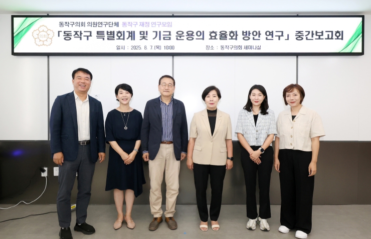 동작구의회 의원 연구단체 ‘동작구 재정 연구모임’(대표의원 김효숙)은 7일 의회 세미나실에서 중간보고회를 개최했다. 연구모임은 특별회계 및 기금의 존립과 운용방식에 대한 전면 재검토를 통해 지방재정의 건정성과 지속성을 확보하고 재정운용의 효율화 방안을 마련하기 위해 구성됐으며, 지난 6월 착수보고회를 시작으로 연구를 진행중이다. 이날 보고회에서는 김효숙 대표의원과 연구모임 소속 신민희이영주장순욱 의원, 사단법인 지방자치발전소 연구원들이 참석한 가운데, 그 동안의 연구 경과를 공유했다. 동작구는 특별회계 3개와 기금 19개 계정을 운영중이며, 재정 자립도에 비해 기금 현재액이 높은 편으로 이에 대한 기금 효율성 제고 방안을 논의했다. 이어 재정운용 관련 역량강화 교육도 진행됐다. 김효숙 대표의원은 “이미 목적을 상실하거나 집행 효과가 낮은 기금의 경우 과감하게 통합 폐지하는 방안을 검토하여, 주민복리를 위해 사용되어야 할 재원이 효율적으로 운용될 수 있도록 마지막까지 최선을 다하겠다”고 말했다.