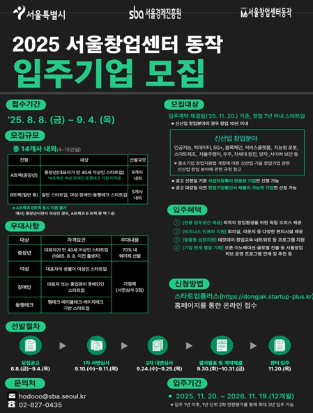 최근 조기퇴직 등으로 만 40세 이상 중장년층의 창업 수요가 빠르게 증가하는 가운데, 서울시가 중장년층의 경력과 전문성을 활용한 기술창업을 체계적으로 지원하기 위해 창업지원시설 입주기업 모집에 ‘중장년 쿼터제’를 처음 도입한다. 서울시 주요 창업지원시설 입주기업 중 중장년 비율은 평균 60% 이상을 차지하고 있으며, 지난 5월 ‘서울창업센터 동작’에서 모집한 ‘중장년 팀빌딩 지원사업’에는 신청기업 수가 전년 대비 2.9배 증가(38개사 → 109개사)해 현장의 높은 수요가 뚜렷하게 입증됐다. 서울시는 이와 같은 현장 수요에 발맞춰, 서남권 창업거점 ‘서울창업센터 동작’의 하반기 신규 입주기업 14개사 중 9개사(70% 내)를 중장년 (만 40세 이상) 창업기업으로 선발할 예정이라고 밝혔다. ‘서울창업센터 동작’은 지하철 1호선 대방역 인근에 위치하며, 중장년 창업뿐 아니라 여성, 노인, 장애인 등 다양한 사회구성원을 위한 기술 개발 기업(동행테크)을 지원하는 데 특화된 창업보육 시설이다. 지난해에는 입주기업(37개사)을 포함해 총 55개의 스타트업을 지원했으며, 연 매출액 393억 원, 투자유치액 73억 원의 성과를 거뒀다. 이번 입주기업 모집은 8월 8일부터 9월 4일까지 4주간 진행되며, 스타트업플러스 플랫폼을 통해 온라인 접수가 가능하다. 모집 대상은 창업 7년 미만의 기술창업기업이며, 입주 공간은 4~15인실 규모(4~5인실 7개, 10~12인실 5개, 13~15인실 2개)로 구성돼 있다. 시는 신청기업을 A트랙(중장년 전형 9개사)과 B트랙(일반 전형 5개사)으로 구분해 신청받고, 각 전형별 평가를 거쳐 총 14개사를 선정할 계획이다. 대표자가 만 40세 이상인 중장년 창업가는 A트랙으로, 여성, 장애인, 동행테크 기업 등은 일반전형인 B트랙으로 지원해야 하며, 가점 대상 기업은 B트랙에서 평가를 받는다. 이와 함께 서울시는 ‘약자와 동행하는 서울’이라는 시정철학 아래 중장년뿐 아니라 다양한 사회구성원의 창업 참여를 확대하기 위해 가점제도 도입한다. 이에 대표자가 여성인 기업, 장애인 기업, 여성·노인・장애인을 위한 기술을 개발하는 동행테크 기업은 서면 평가 시 3점의 가점을 받을 수 있다. ① 대표자가 여성인 창업 기업 ② 대표자 또는 종업원이 장애인인 창업 기업 ③ 여성·노인·장애인을 위한 기술을 개발하는 창업 기업(동행테크)에는 서면 평가 시 3점의 가점이 부여된다. 최종 선정된 기업은 최초 1년간 서울창업센터 동작에 입주하며, 연장 심사(최대 2회)를 통해 최대 3년까지 입주 가능하다. 입주기업은 창업 기초 교육부터 사업모델 고도화, 사업화 지원 및 투자 유치 기회 제공까지 창업 전 주기를 아우르는 스케일업 프로그램을 지원받을 수 있다. 아울러 ‘서울창업센터 관악’ 등 서남권 창업 유관기관과의 연계 프로그램에 참여할 수 있으며, 오픈 이노베이션 및 글로벌 진출을 위한 협업 기회도 제공된다. 최종 입주기업은 서류심사와 발표심사를 거쳐 9월 30일에 스타트업플러스에 공지될 예정이며, 신규 입주자는 11월 20일부터 1년간의 입주계약을 체결하게 된다. 모집 관련 자세한 사항은 스타트업플러스 누리집에서 확인할 수 있으며, 관련 문의는 서울창업센터 동작을 통해 가능하다. 주용태 서울시 경제실장은 “최근 조기 퇴직, 경력 전환 등으로 인해 중장년층의 창업 수요가 빠르게 증가하고 있다”며 “이번 쿼터제는 이러한 사회적 흐름에 맞춰 실질적인 지원 효과를 높이기 위한 수요 기반 조치”라고 밝혔다. 이어, “다양한 배경과 경험을 가진 시민 모두에게 창업의 길이 열려 있어야 하는 만큼, 앞으로도 ‘약자와의 동행’ 시정 철학 아래, 포용성과 효과성을 동시에 갖춘 창업 생태계를 조성해 나가 겠다”고 말했다.