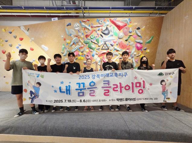 서울 강북구는 지난 7월 19일부터 8월 6일까지 여름방학을 맞은 중‧고등학생을 대상으로 실내 인공암벽 등반 체험 프로그램 ‘내 꿈을 클라이밍’을 운영하고, 참가 학생들의 높은 호응 속에 성공적으로 마무리했다고 밝혔다.‘내 꿈을 클라이밍’은 스포츠클라이밍을 통해 청소년의 체력 증진과 성취감 향상을 도모하는 강북미래교육지구 사업의 일환으로, 강북구가 2023년부터 추진해온 대표적인 체험형 교육 프로그램이다.올해 프로그램에는 총 50여 명의 중·고등학생이 참여했으며, 수유동 ‘락랜드 클라이밍’(도봉로 315, 2층)에서 요일별 반으로 나뉘어 진행됐다. 참가자들은 전문 강사의 지도 아래 기초 자세부터 응용 기술까지 단계적으로 훈련을 받았으며, 각 강습 종료 후에는 2시간의 자유 연습 시간이 제공돼 배운 기술을 실습할 수 있는 시간도 마련됐다.특히, 스포츠클라이밍 국가대표이자 강북구 홍보대사로 활동 중인 ‘암벽 여제’ 김자인 선수가 지난해에 이어 올해도 강습 현장을 찾아 학생들을 격려하고, 직접 시범 등반을 선보이며 큰 호응을 얻었다. 또한, 3주간 모든 수업에 성실히 참여한 학생에게는 강북구에서 이수증을 수여했으며, 참여 학생의 **97%가 프로그램에 대해 ‘만족’**한다고 응답하는 등 매우 긍정적인 반응을 보였다.학생들은 “새로운 경험이었고 매주 기다려질 만큼 즐거웠다”, “클라이밍이 너무 재밌어서 더 배우고 싶다”, “강사님이 친절하고 시설도 쾌적했다”, “내년에도 꼭 다시 참여하고 싶다” 등의 소감을 전했다.이순희 강북구청장은 “청소년들이 클라이밍을 통해 도전의 즐거움과 성취의 기쁨을 느끼며 건강하게 성장하길 바란다”며, “앞으로도 학생 눈높이에 맞춘 체험 프로그램을 적극 발굴하고 지속적으로 지원하겠다”고 밝혔다.