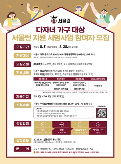 저출생의 주요 원인으로 사교육비와 자녀 수에 따른 양육비 부담이 꼽힌 가운데, 서울시는 다자녀가구를 위한 ‘서울런’ 시범사업을 시작한다. 시는 중위소득 100% 이하, 3자녀 이상 가구를 대상으로 자녀 수 제한 없이 교육 콘텐츠와 교재를 1년간 무상 지원한다. 서울런은 사회‧경제적 이유로 사교육을 받기 어려운 청소년에게 온라인 학습과 멘토링을 무상 제공하는 서울시 대표 교육복지 정책이다. 2021년 9천여 명이던 회원 수는 현재 3만 5천 명으로 늘어났으며, 다자녀가구를 대상으로 한 지원은 이번이 처음이다. 통계청 조사에 따르면 지난해 초·중·고생 사교육비는 약 29조 원으로 4년 연속 최고치를 경신 중이다. 또한 소득 상위 20%의 월평균 교육비(41만 5천 원)는 소득 하위 20%(1만 2천 원)의 34.6배로, 교육비 격차가 심각한 상황이다. 지난해 육아정책연구소가 발표한 자료에 따르면 자녀가 1명인 가구의 양육비 부담은 소득 대비 평균 17.7% 수준인 반면, 3자녀 이상 가구는 47.8%까지 증가하는 등 자녀 수에 따른 양육비가 가계에 큰 부담으로 작용하고 있는 것으로 나타났다. 이에 서울시는 만 6세부터 24세까지의 자녀가 3명 이상이고, 중위소득 100% 이하인 서울시 거주 가정에 자녀 수 제한 없이 3자녀 이상 가구를 대상으로 서울런 서비스를 지원한다. 이번 시범사업은 총 800명(초등학생 400명, 중학생 150명, 고등학생 및 검정고시 준비생 250명)을 선발한다. 참여자는 15개 온라인 콘텐츠(추후 변동 가능) 중 1개를 선택해 1년간 수강할 수 있고, 중·고등학생에게는 연간 20만 원 상당의 교재비도 지원된다. 초등학교급은 학습기기를 활용하는 교육 특성상 교재비는 제공되지 않으며, 모든 참여자는 서울런 학습지원센터의 질의‧답변 서비스와 오픈 강의를 동일하게 이용할 수 있다. 서울런 학습 콘텐츠는 아이스크림 홈런, 엘리하이, 밀크T, 메가스터디, 대성마이맥 등으로 구성된다. 중·고등학교 과정의 경우 EBS 강의는 타 콘텐츠와 중복 수강이 가능하다. 신청은 서울런 누리집에서 8월 11일 오전 10시부터 28일(목) 오후 9시까지 가능하며, 선착순 모집 방식으로 진행된다. 신청 시 건강보험료 납부확인서 등 관련 서류를 함께 제출해야 한다. 건강보험료 납부확인서, 건강보험 자격확인서(세대 구성원 모두 표시), 주민등록등본(필요시 가족관계증명서 추가)을 모두 제출해야 한다. 문의는 서울런 학습지원센터 또는 서울런 고객센터를 통해 할 수 있다. 선정 결과는 9월 1일 개별 문자로 통보되며, 9월 2일(화)부터 3일(수)까지 콘텐츠 선택을 마친 후 9월 중 학습이 시작된다. 서비스는 2026년 8월 31일까지 제공된다. 이번 시범사업은 농협은행(주) 서울본부와 (사)함께하는사랑밭의 후원, 서울 사랑의열매의 기금 지원을 바탕으로 초록우산어린이재단과 협력해 1년간 운영된다. 총 5억 원의 민간 후원금이 투입되며, 학습 이력 분석과 참여자 만족도 조사 등을 통해 향후 본사업 확대 여부를 검토할 예정이다. 한편, 서울런은 인구 감소로 지역 소멸 위기에 놓인 지자체들로부터 지역 간 교육격차를 해소할 수 있는 대안으로 주목받고 있다. 5개 지자체(충청북도, 평창군, 인천시, 김포시, 태백시)가 서울시와 업무협약을 맺고 서울런 도입을 검토하거나 추진 중으로, 현재 서울을 넘어 전국으로 확산되며 공공교육 모델로 자리매김하고 있다. 정진우 서울시 평생교육국장은 “아이를 많이 낳고 키우는 일이 부담이 아닌 희망이 될 수 있도록 서울런이 다자녀 가정에 실질적인 도움이 되길 바란다”라며, “앞으로도 교육 기회의 불균형을 해소하고 모든 아이가 공정한 바탕에서 성장할 수 있도록 서울런을 더 촘촘하게 다듬겠다”라고 말했다.