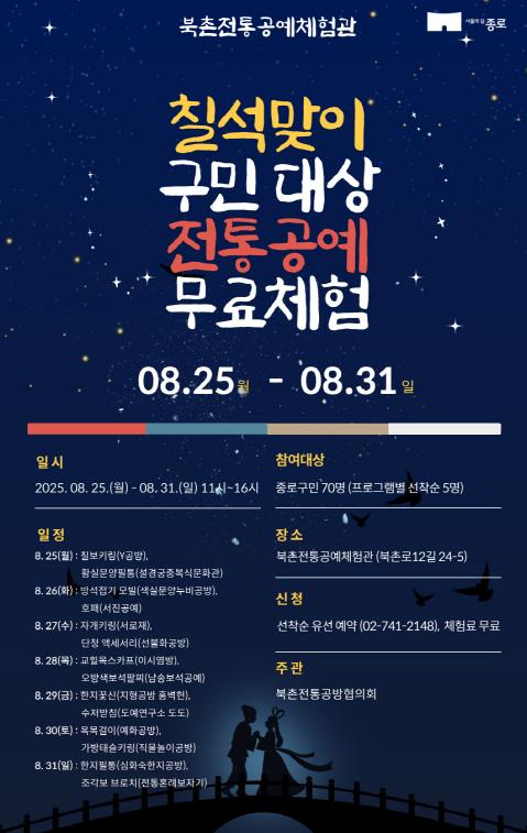 종로구가 2025년 음력 칠월칠석(8월 29일)을 맞아 북촌전통공예체험관(북촌로12길 24-5)에서 `칠석맞이 주민친화행사`를 개최한다.전통공예의 우수성을 알리고 종로구민의 문화예술 향유 기회를 확대하고자 마련한 이번 행사는 북촌전통공방협의회 주관으로 8월 25일부터 31일까지 7일 동안 만나볼 수 있다.프로그램은 칠보키링, 황실문양필통, 모빌, 호패, 자개 키링, 단청 액세서리, 교힐목스카프, 오방색 보석 팔찌, 한지 꽃신, 수저받침, 옥 목걸이, 가방 키링, 한지 필통, 조각보 브로치 등 총 14가지 체험으로 구성했다.참여자들은 북촌에서 활동하는 분야별 명인의 전문적인 지도 아래, 전통공예의 정교함과 아름다움을 경험하며 그 기법과 재료에 대한 이해를 높일 수 있을 전망이다.신청은 북촌전통공예체험관을 통해 전화 예약하면 된다. 대상은 종로구민이고 모집 인원은 프로그램별 선착순 5명씩 총 70명이다. 비용은 전액 무료다. 체험 당일에는 신분증을 반드시 지참해야 한다.한편 종로구는 과거 조선 왕실에 공예품을 납품하던 경공방 밀집 지역 ‘북촌’의 역사와 전통을 잇기 위해 매해 북촌공방축제를 개최하고, 청소년과 지역민을 위한 다채로운 체험 행사를 꾸준히 열고 있다.정문헌 구청장은 “이번 칠석맞이 체험 행사가 구민들에게 우리 전통문화에 대한 자부심을 심어주고, 공예를 매개로 소통하는 뜻깊은 자리가 되길 바란다”라고 밝혔다.