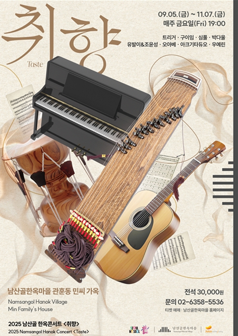 서울시 전통문화공간 남산골한옥마을이 오는 9월 5일부터 11월 7일까지 매주 금요일 저녁, `남산골 한옥콘서트 ‘취향’`을 선보인다. 전통 한옥에서 우리 전통음악을 현대적으로 재해석한 예술가들의 공연과 ‘조향’ 체험을 함께 즐길 수 있는 프로그램이다. 이번 한옥콘서트는 관객의 음악적 ‘취향(趣向)’과 향을 맡는다는 의미의 ‘취향(取香)’이라는 중의적 의미를 담아서 기획됐다. 공연은 매주 금요일 오후 7시부터 50분간 진행되며, 관객들은 공연 관람 후 30분간 공연의 감상과 감각을 담은 향수(10㎖)를 직접 제작해본다. 향수 제작에는 음악 속 기억과 감정을 향으로 간직하는 조향 전문 기업 악센트(AC’SCENT)가 참여한다. 공연은 1차, 2차로 나누어 예매 오픈한다. 1차 예매 대상 공연은 9월 개최되는 4개 공연이다. 한국 전통음악을 고유의 세계관으로 풀어낸 젊은 예술가들의 공연들로 구성됐다. 트리거(9월 5일), 구이임(9월 12일), 심풀(9월 19일), 박다울(9월 26일)이 공연을 이끈다. 가야금, 거문고, 아쟁으로 구성된 ‘트리거(TRIGGER)’는 21세기 한국음악프로젝트 금상 수상 아티스트 팀이다. ‘구이임’은 정가, 경기소리와 피아노, 가야금 연주자로 구성된 그룹으로 전통과 현대를 넘나드는 크로스오버 음악을 선보인다. 소리꾼 3인과 해금·건반·타악 연주자로 구성된 ‘심풀’은 JTBC `풍류대장`등에 출연해 팝소리 장르를 개척했다는 평을 받았다. 마지막으로 거문고 연주자 ‘박다울’은 JTBC `슈퍼밴드2` 출연 이후 밴드 KARDI 활동과 함께 다양한 장르와 국악의 융합을 시도하고 있다. 1차 예매 오픈은 8월 14일 오후 2시부터 남산골한옥마을 누리집에서 진행된다. 티켓은 전석 3만 원이며 65세 이상·장애인·국가유공자 등은 50%, 예술인패스 소지자·청소년·외국인은 30%, 재관람자는 15%, 기후동행카드 소지자는 10% 할인 혜택을 받을 수 있다. 경자인 서울시 문화유산활용과장은 “전통 한옥에서 국악 공연과 조향 체험을 동시에 즐길 수 있는 이번 프로그램은 문화유산을 새로운 방식으로 향유하는 기회가 될 것”이라며 “앞으로도 젊은 세대들이 우리 전통 문화에 자연스럽게 다가갈 수 있도록 오감을 활용한 체험형 콘텐츠를 대폭 강화하겠다”라고 말했다.