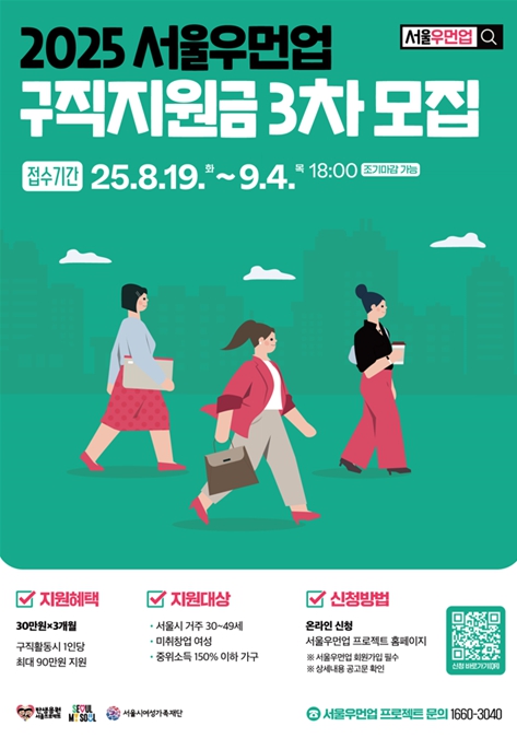 출산, 육아 등으로 일터를 떠나면서 경력이 단절된 경력단절여성과 미취업여성 등이 다시 일할 수 있도록 월 30만 원씩 최대 3개월간 지원하는 ‘서울우먼업 구직지원금’ 올해 마지막 신청이 시작된다. 서울시는 ‘2025 서울우먼업 구직지원금’ 3차 참여자 신청을 8월 19일부터 9월 4일까지 받는다고 밝혔다. ‘서울우먼업 구직지원금’은 경력단절 및 미취업여성의 경제활동 재진입을 지원하는 ‘서울우먼업 프로젝트’의 하나로, 오랜 경력단절로 떨어진 자신감을 회복하고 도전할 수 있는 용기를 얻을 수 있도록 구직 활동에 필요한 비용을 지원하는 사업이다. 2023년 첫 시행 이후 지금까지 총 6,501명이 구직지원금을 받았으며, 이 중 2,213명(34%)이 취‧창업에 성공해 경제활동에 복귀했다. ‘서울우먼업 프로젝트’는 서울시 저출생 대책인 「탄생응원 서울 프로젝트」의 하나로, 서울시의 대표 여성 일자리 지원사업이다. ▴경력단절 3040여성이 구직활동에 사용할 수 있는 ‘구직지원금’(30만 원×3개월) ▴3개월간 기업에서 일 경험을 쌓을 수 있는 ‘인턴십’(생활임금×3개월) ▴인턴을 정규직으로 채용하는 기업에 지원하는 ‘고용장려금’(100만 원×3개월)으로 구성되어 있다. 3차 신청은 올해 마지막 신청으로, 550명을 모집한다. 앞서 1‧2차 신청에서는 2,489명이 선정됐다. 신청은 ‘서울우먼업프로젝트’ 누리집을 통해 온라인으로 하면 된다. 모집공고는 8월 12일부터 서울시 및 ‘서울우먼업’ 누리집에 게시된다. 지원요건은 서울시 거주 여성 중 만 30~49세(1975년 1월 1일~1995년 12월 31일) 미취업 또는 미창업자로, 중위소득 150% 이하여야 한다. 18세 미만 자녀가 있는 경우 가점이 부여된다. 주 15시간 미만 단시간 근로자도 신청 가능하나, 정부‧지자체 유사 사업에 참여 중인 경우 중복 신청이 불가하다. 선정된 참여자에게는 매월 구직활동 실적을 확인 후 월 30만 원씩 최대 3개월간 ‘우먼업 포인트’로 구직지원금이 지급된다. 구직지원금을 받는 중 취‧창업에 성공한 경우에는 ‘취창업 성공금’ 30만 원이 추가로 지급돼 구직지원금 포함 최대 90만 원까지 지원받을 수 있다. 우먼업 포인트는 교육비, 교육기자재 구입, 자녀돌봄비, 면접비용 등 실질적인 구직 활동에 사용할 수 있다. 구직지원금 지원 대상자로 선정되면 구직지원금뿐만 아니라, 서울시 여성인력개발기관(총 26개소)을 통해 1:1 진로상담, 맞춤형 취업컨설팅, 직업훈련, 취업 연계 등 종합적 취업지원 서비스를 함께 받을 수 있다. 주요 직업훈련 분야는 ▴정보통신(IT) ▴경영‧회계 ▴사회복지 ▴보육 ▴서비스 등이며, 각 센터에서는 전문 직업상담사들이 진로‧취업 상담을 제공하고, 일자리 매칭 및 사후관리까지 전 과정을 밀착 지원한다. 아울러, 서울시는 시민들의 참여를 독려하기 위해, 8월 14일부터 17일까지 코엑스 A홀에서 열리는 ‘제48회 베이비페어’에 상담 부스를 운영할 예정이다. 행사 기간 중 ‘우먼업 프로젝트’ 참여 요건, 신청 방법, 지원내용 등 현장 설명과 질의응답이 진행되며, 사전 신청 없이 현장에서 누구나 참여할 수 있다. 한편, 2024년 우먼업 프로젝트 참여자 2,598명을 대상으로 한 만족도 조사 결과 우먼업 프로젝트가 경제활동 복귀에 도움이 됐다고 응답한 비율은 구직지원금 98.3%, 인턴십 94.9%에 달했다. 구직지원금 참여자 월평균 구직활동 횟수는 2.09회에서 4.73회로 2배 이상 증가했으며 사업참여로 구직활동을 계획보다 앞당기게 된 참여자 비율은 48.6%로 높게 나타났다. 구직지원금 참여자의 약 90%가 실질적 구직활동에 도움이 됐다고 응답했으며, 특히 경제적 부담 경감을 통해 구직활동을 다시 시작할 수 있게 됐다고 응답했다. 서울시는 이와 같은 피드백을 바탕으로, 직무 맞춤형 훈련 프로그램 확대, 자녀돌봄 연계 강화, 사후관리 기간 연장 등 후속 보완 방안을 지속적으로 발굴하고 있다. 마채숙 서울시 여성가족실장은 “올해 3년째에 접어드는 구직지원금은 단순한 생계지원이 아니라 경력단절 여성의 실질적인 취업을 견인하는 마중물 역할을 하고 있다.”라며 “많은 경력단절 여성들이 구직지원금을 통해 경력을 재설계하고 노동시장에 성공적으로 재진입할 수 있도록 최선을 다하겠다.”라고 말했다.