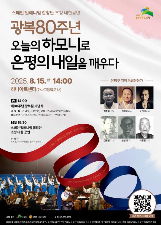 서울 은평구는 오는 15일 광복절을 맞아 ‘제80주년 광복절 기념식 및 특별공연’을 개최한다고 밝혔다.올해 구호는 “광복 80주년, 오늘의 하모니로 은평의 내일을 깨우다”이며, 은평한옥마을과 진관사가 위치한 진관동 하나아트센터에서 오후 2시부터 열린다.이번 행사는 광복 80주년을 기념해 순국선열과 애국지사들의 숭고한 희생과 나라 사랑 정신을 기리고, 광복의 참된 의미를 되새기기 위해 마련됐다. 광복회 은평구지회를 비롯한 보훈단체 회원과 가족, 일반 구민 등 8백여 명이 참석한다.진관사는 일제강점기 일장기에 태극기를 덧그리며 독립운동에 앞장선 백초월 스님의 항일 정신이 서린 사찰이다. 이를 기리기 위해 1부 기념식에서는 ‘일장기 위에 태극기 그리기’ 퍼포먼스, 만세삼창, 광복절 노래 제창이 진행된다.2부 특별공연은 세계 유일의 한국어 공연 외국 합창단인 ‘스페인 밀레니엄 합창단’이 공연한다. 1999년 임재식 단장이 창단한 이 합창단은 스페인 출신 외국인 단원들이 한국의 민요와 가요를 한국어로 부르는 것으로 유명하다. 이날 광복절의 의미를 담아 전통 가곡과 현대 감각을 접목한 무대를 선보일 예정이다.이 외에도 행사장 주변에서는 은평구 연고 독립운동가 사진전, 태극기 나무 포토존, 페이스페인팅 등 다양한 부대행사도 운영해 행사장을 찾은 가족 단위 방문객들이 광복절의 의미를 즐기고 체험할 수 있도록 했다. 김미경 은평구청장은 “광복 80주년은 단지 과거를 기념하는 것이 아니라, 자유와 정의의 가치를 이어가는 약속의 날이다”며 “은평의 미래세대와 지역사회가 함께 기억하고 실천하는 역사의 도시로 계속 나아갈 것이다”고 밝혔다.