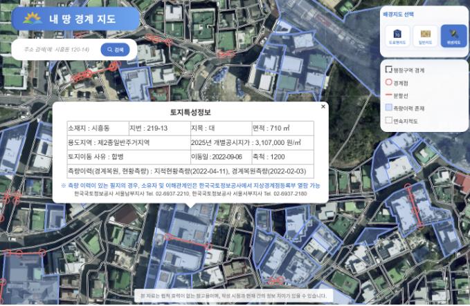 금천구가 전국 최초로 인공지능(AI) 기술을 활용해 토지경계정보를 한눈에 확인할 수 있는 ‘내 집 경계정보 확인 시스템’을 구축하고, 11일부터 본격 서비스를 시작했다.이에 따라 금천구청 누리집에서 종합민원(부동산민원) 내 ‘내 땅 경계 지도’ 메뉴를 이용하면 토지경계를 실시간으로 확인할 수 있다. 금천구 내 건물번호판에 부착된 QR코드를 통해서도 현장에서 토지경계를 바로 확인할 수 있다.또한 금천구청 누리집에서 클릭 한 번으로 지목, 면적, 토지이동 사유, 공시지가 등 토지대장 핵심 정보를 쉽게 열람할 수 있다. 정부24 접속이나 관공서 방문 등의 복잡한 절차 없이 필요한 정보를 손쉽게 확인할 수 있게 됐다.앞서 여러 가지 사유로 주민들의 토지경계 확인 요청이 많았다. 이에 구는 이제까지는 측량에 따른 시간적, 경제적 비용을 들여야했지만 ‘내 집 경계정보 확인 시스템’으로 이 문제를 해소했다고 설명했다.구는 우선 최근 10년치 측량이력 자료 및 지상경계점 좌표 정보, 현장 위치 사진 등을 수집한 후 데이터 유효성을 검사하고 웹 표준 파일로 변환하는 등의 처리를 진행했다.이후 AI 기술을 활용해 별도의 측량 없이 토지경계를 확인할 수 있도록 시스템을 구축했다고 구는 설명했다.특히 외부 용역 없이 기획부터 설계, 개발까지 전 과정을 공무원이 직접 수행하여 약 4000만 원의 비용을 절감한 한편 직접 스마트 행정 혁신을 실현했다고 설명했다.유성훈 금천구청장은 “내 집 경계정보 확인 시스템이 주민 생활 편의를 높이고 토지경계 민원을 보다 신속하게 해결하는 데 실질적으로 기여할 것”이라며 “금천구가 AI를 활용한 스마트 행정을 선도해 나가는 사례가 될 것”이라고 말했다.