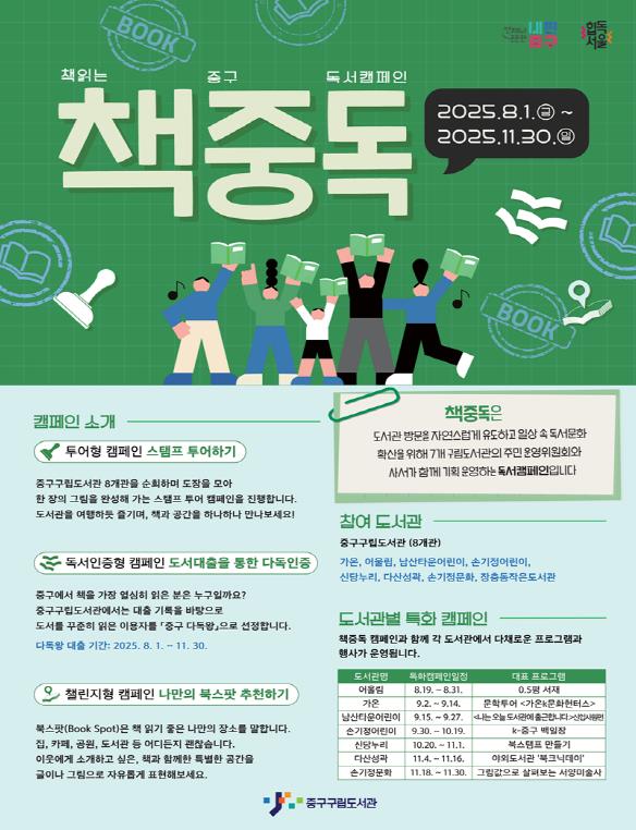 서울 중구는 오는 19일부터 11월30일까지 중구 내 7개 구립도서관과 장충동작은도서관에서 주민 주도 독서 캠페인인 ‘책·중·독(책읽는 중구 독서캠페인)’을 진행한다고 밝혔다.‘책·중·독’은 도서관 이용 활성화와 독서 문화 확산을 위한 캠페인으로, 도서관 우수이용자들로 구성된 ‘도서관운영위원회’가 기획부터 실행까지 전 과정에 참여해 완성한 첫 프로그램이다.앞선 지난 3월, 중구의 7개 구립도서관은 각각 5~8명의 운영위원을 위촉했다. 운영위원들은 “더 많은 주민이 도서관을 함께 이용하면 좋겠다”라는 바람을 담아, 도서관 이용 활성화를 위해 머리를 맞댔다. 4월부터 여러 차례 회의를 거치며 아이디어를 다듬어 구체화하고 슬로건을 확정했다.약 5개월간 준비 끝에 탄생한 ‘책·중·독’은 누구나 쉽게 참여할 수 있는 프로그램으로 구성됐다. 프로그램은 △도서관을 순회하며 도장을 모아 하나의 그림을 완성하는 ‘스탬프 투어’△대출 기록을 바탕으로 꾸준히 책을 읽은 주민을 선정하는 ‘중구 다독왕’△책과 공간을 주제로 이웃과 독서 경험을 공유하는 ‘나만의 북스팟 추천하기’등 다양하게 마련됐다. 모든 프로그램은 별도의 신청 없이, 도서관을 방문하면 누구나 자유롭게 참여할 수 있다. 이와 함께 도서관별 개성을 살린 특화 프로그램도 2주 간격으로 운영된다. 오는 19일 어울림도서관을 시작으로 ▷가온도서관 ▷남산타운어린이도서관 ▷손기정어린이도서관 ▷신당누리도서관 ▷다산성곽도서관 ▷손기정문화도서관 순으로 릴레이 형식으로 진행된다. 필사노트 제작, 북스탬프 만들기, 어린이 사서 체험, 야외도서관 운영 등 다채로운 활동이 준비돼 있다.임정빈 가온도서관 운영위원은 “평소 애용하던 도서관에서 직접 만든 프로그램이 열린다니 설레고 뿌듯하다”며 “프로그램을 통해 이웃들이 도서관을 더 편하게 이용하고 함께 어울릴 수 있게 되길 바란다”고 소감을 전했다.구는 오는 12월에는 도서관운영위원들의 활동과 성과를 돌아보고 발전 방향을 논의하는 자리를 마련할 예정이다.김길성 중구청장은 “주민들이 평소 도서관을 이용한 경험을 바탕으로 직접 기획한 프로그램이라 더욱 의미가 크다”며 “도서관이 주민에게 더욱 친근하게 다가가는 문화 중심지가 되도록 지원을 아끼지 않겠다”고 밝혔다.