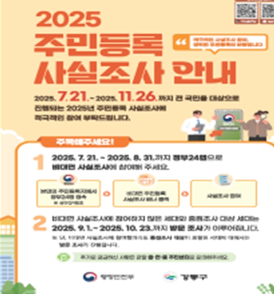강동구는 오는 11월 26일까지 관내 전 세대를 대상으로 ‘2025 주민등록 사실조사’를 실시한다고 13일 밝혔다. 주민등록 사실조사는 실거주지와 주민등록지의 일치 여부를 확인하여 정확한 행정자료를 확보하기 위한 것으로, 비대면 조사와 방문 조사가 순차적으로 진행된다. 먼저, 8월 31일까지 진행되는 비대면 조사는 대상자가 본인의 거주지(주민등록지) 반경 50m 이내에서 ‘정부24’앱에 접속하여 조사 항목에 응답하는 방식으로 이뤄진다. 주소지가 같은 세대별 대표 1인이 세대 전체에 대한 조사에 일괄 응답할 수 있다. 비대면 조사 이후 9월 1일부터 10월 23일까지는 비대면 조사에 참여하지 않은 세대와 중점 조사 대상이 포함된 세대를 대상으로 담당 공무원과 통장이 직접 거주지를 찾아가는 ‘방문 조사’가 실시된다. 특히, 중점 조사 대상이 포함된 세대는 비대면 조사에 참여했더라도 방문 조사가 진행된다. 중점 조사 대상의 경우 100세 이상 고령자, 5년 이상 장기 거주불명자, 고위험 복지위기가구, 사망의심자, 장기 미인정 결석 및 학령기 미취학 아동이 포함된 세대다. 향후, 조사 결과가 실거주지와 주민등록지가 불일치할 경우, 최고 및 공고 절차를 거쳐 담당 공무원이 주민등록표를 직권으로 정리하게 된다. 김두호 자치행정과장은 “주민등록 사실조사는 국가와 지방자치단체의 정책 수립의 기초가 되는 중요한 조사”라며, “정부24앱을 사용한 비대면 조사에 많은 참여를 부탁드리며 방문 조사 시 구민의 불안감 해소를 위해 통장 및 공무원의 ‘사실조사원 증명서’ 패용을 확인 후 적극적인 참여와 협조를 당부드린다”라고 말했다. 한편, 조사 기간 중 거주불명자로 등록된 주민이 거주지 관할 동주민센터에 자진 신고하면 과태료를 최대 80%까지 감면받을 수 있다.