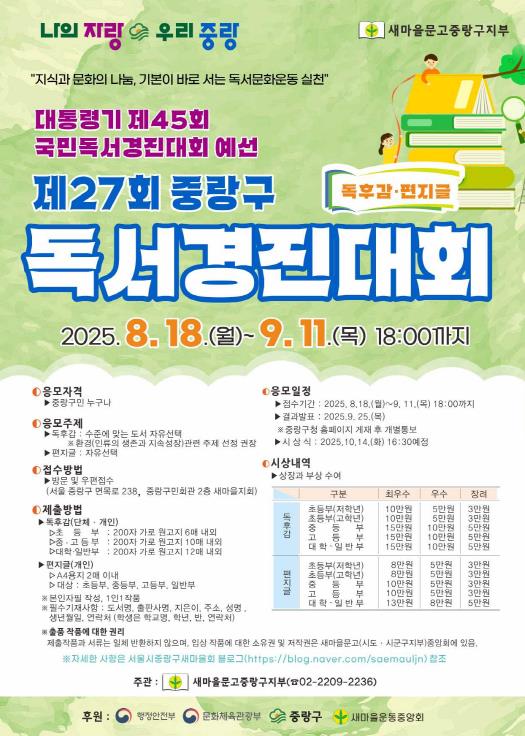 중랑구는 책 읽는 문화를 확산하고 구민의 창의적 사고와 표현력을 높이기 위해 ‘제27회 중랑구 독서경진대회’를 개최한다. 이번 대회는 대통령기 ‘제45회 국민독서경진대회’ 예선으로, 중랑구민이면 누구나 참여할 수 있다.응모 부문은 독후감과 편지글로 나뉜다. 독후감은 연령별 수준에 맞는 도서를 자유롭게 선택해 작성하되, 올해는 환경과 인류의 지속 가능한 성장 등 시의성 있는 주제를 권장한다. 편지글 역시 주제를 자유롭게 선택해 작성할 수 있다.원고 분량은 ▲초등부 200자 원고지 6매 내외 ▲중·고등부 10매 내외 ▲대학·일반부 12매 내외다. 편지글은 A4 용지 2매 이내로 작성하며, 모든 응모작은 반드시 본인 자필로 작성해야 하고 1인 1작품만 제출할 수 있다.응모 기간은 8월 18일(월)부터 9월 11일(목) 오후 6시까지다. 응모자는 작성한 작품과 함께 도서명, 출판사명, 지은이, 주소, 성명, 생년월일, 연락처(학생은 학교명, 학년, 반, 연락처)를 기재해 중랑구민회관 2층 새마을지회로 방문 또는 우편으로 제출하면 된다.심사를 거쳐 총 30작품을 선정하며, ▲최우수상 10명 ▲우수상 10명 ▲장려상 10명 등 총 200만 원 상당의 상장과 부상을 수여한다. 수상작 발표는 9월 25일(목) 중랑구청 누리집에 게재하고, 개별 통보한다. 시상식은 10월 14일에 열린다.류경기 중랑구청장은 “독서는 지식과 문화의 폭을 넓히고 삶의 질을 높이는 중요한 활동”이라며 “이번 대회를 통해 구민들이 독서의 즐거움을 나누고, 건강한 독서 문화를 확산하는 계기가 되길 바란다”고 말했다.