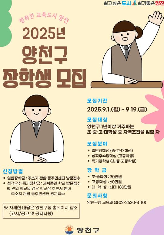 양천구는 지역 학생들의 균등한 교육 기회 보장과 학업능력 향상을 위해 ‘2025년 양천구 장학생’ 170명을 선발, 총 1억 5천만 원 규모의 장학금을 지급한다고 18일 밝혔다.구는 2023년부터 장학기금을 추가 출연하며 매년 장학금 규모와 지원 대상을 넓혀왔다. 올해는 지난해 대비 선발인원은 50명, 장학금 총액은 5천만 원이 늘어났으며, 특히 일반장학금 지원 대상을 기존 고등학생·대학생에서 중학생까지 확대해 보다 폭넓은 연령층의 학생들이 장학금 혜택을 누릴 수 있게 됐다.장학생은 △일반장학생 △성적우수장학생 △특기장학생 등 세 분야로 나누어 선발한다. ‘일반장학생’은 중·고·대학생을 대상으로 하며, 기준 중위소득 100% 이내(대학생은 한국장학재단 학자금 지원구간 5구간 이내)여야 한다.‘성적우수장학생’은 직전 학기 성적이 상위 20% 이내인 고등학생을 대상으로 선발한다. 고교학점제 적용 학생의 경우 절대평가 과목에서 80% 이상 A등급을 취득하고 상대평가 과목 평균이 1.42등급 이내여야 한다. 9등급제 적용 학생은 과목별 석차 평균 2.75등급 이내가 기준이다.‘특기장학생’은 예술·체육·과학 분야에서 광역시·도 단위 이상 대회 3위 이내 입상한 초·중·고등학생이 해당된다.장학금 지급액은 학령 단계별로 차등 적용된다. 초·중학생은 1인당 30만 원, 고등학생은 60만 원, 대학생은 50만 원에서 최대 180만 원까지 지원받을 수 있다.신청 접수는 오는 9월 1일부터 19일까지 진행된다. 양천구에 1년 이상 거주해야 하며, 일반장학생은 주소지 동주민센터에서, 성적우수·특기장학생은 재학 중인 학교를 통해 접수하면 된다. 단, 관외 학교 재학생은 학교장 추천서를 받아 동주민센터에 직접 제출해야 한다.장학생 선발 결과는 11월 초 개별 통보되며, 장학금은 같은 달 중순 지급된다. 자세한 사항은 양천구청 교육과로 문의하면 된다.이기재 양천구청장은 “성적과 특기, 생활여건 등을 종합적으로 고려해 우수한 학생들이 차별 없이 지원받을 수 있도록 선발기준을 마련했다”며 “앞으로도 구 장학사업이 학생들에게 배움의 기회를 제공하고 원하는 꿈을 펼칠 수 있는 든든한 디딤돌이 될 수 있도록 내실 있게 운영하겠다”고 말했다.
