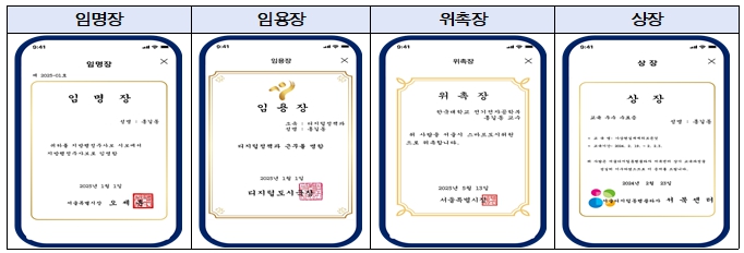 서울시가 앞으로 임명장, 위촉장, 상장 등 각종 증서를 종이 대신 모바일로 발급하는 ‘디지털증서’ 방식을 전면 도입한다. 2021년부터 3년간의 시범운영을 통해 발급 편의성과 효율성을 입증한 만큼, 오는 2025년부터 본청과 사업소를 시작으로 2027년까지 자치구와 산하 공공기관으로 전면 확산한다는 계획이다. 서울시는 그동안 ‘서울지갑’ 앱을 활용한 디지털증서 발급을 꾸준히 추진해왔다. 실제로 그간 임명장, 임용장, 위촉장, 상장 등 총 1,767건을 디지털로 발급해, 발급 기간 단축과 보관·공유 편의성, 위·변조 방지 효과 등에서 긍정적인 평가를 받아왔다. 이러한 성과를 바탕으로 디지털증서를 전 부서·자치구·산하기관까지 확대를 추진한다. 최근 3년간 서울시가 발급한 증서는 연평균 1만 5천여 건에 달한다. 종이증서 1건당 제작과 수여에 1만 1천 원이 소요돼, 연간 총비용이 약 1억 7천만 원에 이른다. 여기에 인쇄, 직인 날인, 수여 등 여러 단계를 거치는 절차 때문에 발급까지 평균 5~10일이 걸려 업무 부담이 컸다. 디지털증서는 ‘서울지갑’ 앱을 통해 즉시 발급이 가능하고, 추가적인 예산도 들지 않아 효율성이 높다. 5급 이하 전보공무원의 임용장만 디지털로 전환해도 연간 약 5,553만 원의 예산을 절감할 수 있다. 서울시는 디지털증서 전면 전환을 2025년부터 2027년까지 세 단계로 나누어 추진한다. 먼저 2025년에는 市 본청과 일부 사업소를 중심으로 시범운영을 시작한다. 기후환경정책과, 정원도시정책과, 서울기록원 등 지정 부서에서 복직자 임용장이나 위원회 위촉장 등 발급이 잦은 증서를 디지털증서로 발급하며, 2026년 1월 정기 인사부터는 5급 이하 전보공무원의 임용장을 전면 디지털로 전환한다. 이와 함께 부서별로 발급하는 종이증서의 절반 이상을 디지털로 바꾸는 목표제를 도입해 관리할 계획이다. 2026년에는 발급 시스템을 고도화하고 자치구로 확대한다. 기존 4종의 디지털증서에 표창장과 감사장을 추가하여 총 6종을 발급할 수 있게 하고, 자치구별 다양한 증서 양식과 직인을 반영한다. 디자인 품질도 높여 고해상도 도장과 종이 질감, 입체감을 구현한다. 같은 해 하반기부터는 자치구 전역으로 보급을 확대할 계획이다. 25개 자치구 확산은 희망자치구 수요조사 및 시범구 선정, 담당자교육 등을 통해 순차적으로 진행하고 전용 콜센터 운영을 병행할 예정이다. 마지막으로 2027년부터는 서울시와 자치구 산하의 공사·공단, 출연기관, 자원봉사센터 등 모든 공공기관에 디지털증서를 전면 도입한다. 각 기관이 자체 양식을 등록하고 발급 권한을 관리할 수 있는 ‘서울시 증서발급 통합플랫폼’을 구축해, 발급 이력 관리와 사용자 통계, 진위 검증 기능까지 제공하는 표준화된 발급 체계를 완성할 방침이다. 종이증서의 디지털증서로 전환에 박차를 가하기 위해 기술 지원과 홍보체계를 더욱 강화하고, 디지털증서 발급률을 행정 성과지표로도 적극 활용할 예정이다. 아울러 우수사례 홍보와 시민 참여 캠페인을 병행해 일상생활 속 디지털증서의 필요성과 편의성을 직접 체감할 수 있도록 하여 사용을 더욱 활성화한다. 서울시는 신규공무원 및 고위직 승진자, 시민 대상 표창·위촉 등 실물증서 수여의 상징성과 소장가치가 중요한 경우에는 종이증서와 디지털 증서를 병행 발급해 디지털 전환 과정에서의 거부감을 줄이고, 수여 문화의 품격을 유지할 계획이다. 강옥현 서울시 디지털도시국장은 “디지털증서는 효율성과 친환경, 그리고 보안성을 동시에 확보할 수 있는 혁신 행정의 대표 사례”라며 “시범운영에서 검증된 효과를 바탕으로 종이 없는 수여문화를 정착시키고, 시민이 체감할 수 있는 스마트행정을 구현해 나가겠다”고 말했다.