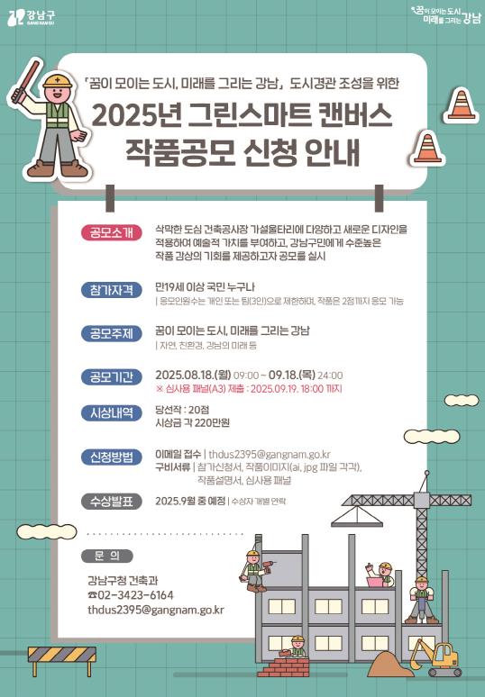 꿈이 모이는 도시, 미래를 그리는 강남구가 공사장 가림막을 예술 공간으로 탈바꿈시키는 ‘그린스마트 캔버스 작품 공모’을 개최한다. 접수는 8월 18일부터 9월 18일까지며, 선정된 작품은 강남의 주요 거리에 설치돼 시민과 관광객이 매일 마주하는 ‘도시 속 전시작’이 된다.이 사업은 2022년 시작 이후 지금까지 71점의 수상작을 선정해, 대형 공사장과 간선도로변, 번화가 등의 공사장 100여 곳에 설치했다. 지역 주민과 방문객들로부터 “거리를 걷다 보면, 공사장 가림막이 멋진 그림으로 꾸며져 있어 기분이 좋아진다”는 호평을 받으며, 공사 현장의 삭막한 이미지를 바꾸는 데 큰 효과를 거뒀다.작품 주제는 민선 8기 슬로건 ‘꿈이 모이는 도시, 미래를 그리는 강남’으로, 자연·친환경·미래 등 강남의 비전을 시각적으로 표현하는 작품을 찾는다. 만 19세 이상이면 누구나 개인 또는 3인 이내 팀 단위로 참가할 수 있으며, 1인(팀)당 최대 2점까지 응모할 수 있다.디자인은 높이 6m 규모의 가설울타리에 실제 시공이 가능해야 하며, 팝아트·타이포그래피·일러스트 등 세련되고 경쾌한 이미지로 주변 환경과 조화를 이뤄야 한다. 내구성·경제성·안전성도 고려해야 하며, 울타리 상부 오브제 제안도 가능하다. 심사는 창의성(40점), 활용성(30점), 공공성(20점), 기타(10점) 항목으로 이뤄진다. 강남구민, 청년 작가(만 39세 이하), 장애 예술가에게는 가산점이 주어진다.응모를 원하는 사람은 구청 홈페이지 고시공고 게시판에서 서류를 내려받은 후 참가신청서와 작품이미지(ai, jpg), 작품설명서, 심사용 패널 등을 이메일로 제출하면 된다. 이 중, 심사용 패널은 9월 18일 오후 6시까지 구청 건축과에 직접 제출해야 한다.최종 심사를 통해 20점을 선정해 당선작 각 1인(1팀)에게는 220만 원의 상금을 수여한다. 수상작은 강남구 거리 곳곳에 있는 건축공사장 가설울타리 디자인에 활용된다. 자세한 내용은 건축과로 문의하면 된다.조성명 강남구청장은 “공사장 울타리를 예술로 채워 도시 미관을 개선하고, 일상 속에서 문화를 즐기는 환경을 만들고 있다”며 “올해도 참신하고 개성 있는 작품이 거리 풍경을 바꾸길 기대한다”고 말했다.