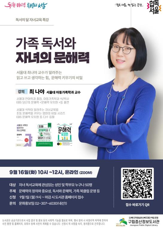 서울 은평구는 구립 증산정보도서관이 ‘힙독 서울, 책 읽는 은평’ 사업으로 독서의 달 특강을 마련한다고 밝혔다. 이번 특강은 서울대학교 아동가족학과 최나야 교수를 초청해 ’가족 독서와 자녀의 문해력’을 주제로 진행된다.최나야 교수는 아동의 문해력, 구어능력, 이중언어를 연구하는 전문가로, `서울대 석학이 알려주는 자녀교육법:문해력`, `EBS 문해력 유치원` `초등 문해력을 키우는 엄마의 비밀` 시리즈 등 다수의 저서를 집필했다. 또한 EBS `당신의 문해력` 방송에도 출연하는 등 다양한 활동을 이어가고 있다.특강에서는 △문해의 정의와 중요성 △독서와 문해력의 관계 △자녀 독서 지도 방법 △가족 북클럽 운영 등을 주제로 다룰 예정이다.강의는 내달 16일 오전 10시부터 온라인(ZOOM)으로 실시되며, 접수는 내달 1일 오전 9시부터 구립 증산정보도서관 누리집을 통해 가능하다.도서관 관계자는 “이번 특강이 자녀들의 문해력 향상뿐 아니라 부모들이 자녀 교육에 대한 자신감을 얻고, 가정 내 읽기 환경을 조성하는 데 도움이 되기를 기대한다”며, “자녀교육에 관심 있는 지역 주민들의 많은 관심과 참여를 바란다”고 말했다.