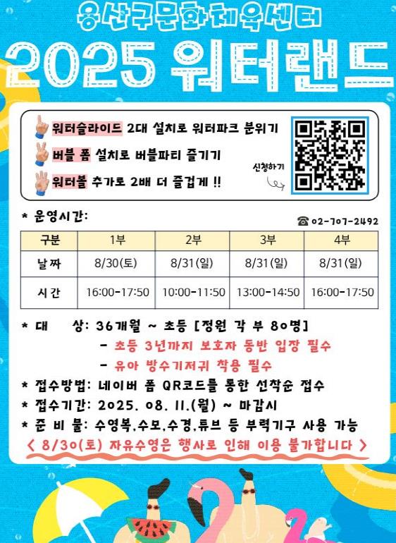 서울 용산구는 ‘약자와의 동행’ 일환으로 오는 8월 30일부터 31일까지 이틀간 용산구문화체육센터(백범로 350) 수영장에서 `2025 워터랜드` 행사를 개최한다고 밝혔다.이번 행사는 용산구시설관리공단산하 문화체육센터가 주관하며, 어린이(생후 36개월~초등학생)와 장애인을 대상으로 운영된다.어린이 대상 프로그램은 이틀간 총 4회 진행된다. ▲1부: 8월 30일 16:00~17:50 ▲2부: 8월 31일 10:00~11:50 ▲3부: 8월 31일 13:00~14:50 ▲4부: 8월 31일 16:00~17:50회차별 정원은 80명이며, 초등학교 3학년 이하 어린이는 보호자 동반이 필수다. 또한 유아 참가자는 방수 기저귀를 착용해야 한다.장애인 대상 프로그램은 8월 30일 하루 동안 총 2회 진행된다. △중증장애인독립생활연대: 8월 30일 10:00~11:50 △용산구장애인가족지원센터: 8월 30일 13:00~14:50각 단체 소속 장애인 30명이 보호자(활동지원사)와 함께 참여해 자유롭게 물놀이를 즐길 예정이다.센터는 수영장 내에 ▲물미끄럼틀(워터 슬라이드) ▲거품놀이터(버블폼) ▲놀이공(워터볼) 등 다채로운 물놀이 시설을 마련해 워터파크 분위기를 연출한다. 참가자는 구명조끼, 튜브, 부력기구 등을 직접 준비해 자유롭게 이용할 수 있다.특히 장애인 참가자를 위해 수중 체조 지도자를 배치해 물 적응을 돕고, 사전 회의·점검과 유관 기관 협의, 안전 근무자 배치 및 교육 등 철저한 준비를 통해 안전관리에 만전을 기할 예정이다.행사 참여 신청은 네이버폼 정보무늬(QR코드)를 통해 가능하다.성기욱 용산구시설관리공단 이사장은 “어린이와 장애인이 함께 즐길 수 있는 물놀이 행사를 4년째 이어오고 있다”라며 “앞으로도 가족 친화형 프로그램을 지속적으로 제공하고, ESG(환경·사회·투명경영) 실천에 공단이 앞장서겠다”라고 밝혔다.박희영 용산구청장은 “생활체육 분야에서 사회적 약자를 위한 프로그램 마련은 필수”라며 “문화체육센터에서 구민 가족들이 올여름 최고의 추억을 만들길 바란다”라고 강조했다.이번 `2025 워터랜드`는 ‘2025년 서울시 약자동행지수 우수사례’로 선정돼 의미를 더했다.또한 용산구는 `2025년 공공체육시설 운영 종합계획`에 따라 ▲생활체육 인프라 확충 ▲안전하고 쾌적한 시설 조성 ▲구민 이용률 제고 ▲사회적 약자와의 동행 등 4대 분야 16개 과제를 적극 추진하고 있다.특히 올해는 대표적으로 ‘용산 동부권 첫 공공 수영장’인 이태원초등학교 수영장 운영을 시작한다. 현재 시설 개선 공사 공정률은 약 70%이며, 오는 9월 말 신규 회원 모집을 시작해 10월 정식 개관할 예정이다.또한 9월부터는 △용산구문화체육센터 △원효로다목적실내체육관 △한강로 피트니스센터 △이태원초등학교 수영장 등 4개 체육시설에서 구민 우선 등록제를 시행한다. 기존에는 거주지와 관계없이 매월 20일부터 재등록, 24일부터 신규 접수가 가능했으나, 앞으로는 ▲용산구민: 20일 재등록·23일 신규 접수 ▲타 구민: 24일부터 일반 접수가 가능하도록 제도를 개선했다.