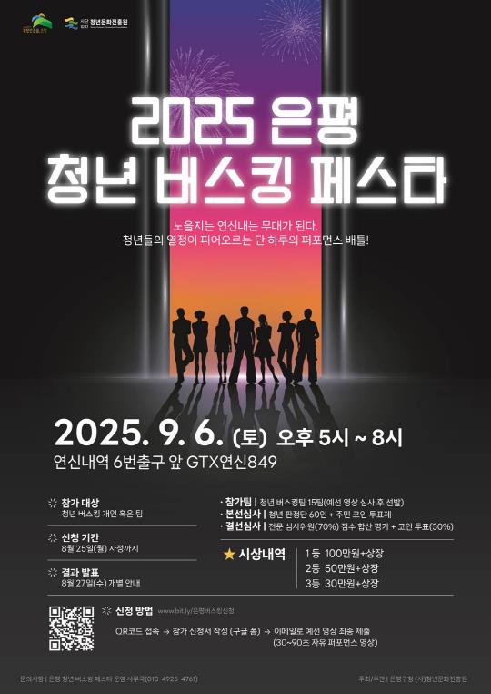 서울 은평구는 ‘은평 청년 버스킹 페스타‘를 개최하고 경연 참가자를 모집한다고 밝혔다.‘은평 청년 버스킹 페스타‘는 버스킹 경연을 통해 청년들의 지역 활동 참여의 장을 마련하고, 다른 세대와 자연스럽게 교류하며 청년과 지역이 함께 성장할 수 있도록 하자는 취지로 마련됐다.페스타는 내달 6일 토요일 오후 5시 GTX연신849(구 물빛공원)에서 열리며, 총 15팀의 참가자들이 모여 경연을 펼친다. 무대를 보는 주민들은 마음에 드는 무대를 코인으로 직접 투표할 수 있다.경연 참가자 모집은 오는 25일까지이며, 경연에 신청하려면 포스터 내 큐알(QR)코드로 신청서를 작성하고 30초~90초 공연 영상을 이메일로 제출하면 된다.또한 청년들의 참여 확대를 위해 청년 판정단을 모집해 본선 현장에서 주민들과 함께 투표에 참여하며, 판정단 신청은 1365 자원봉사 포털을 통해서 하면 된다.예선 심사는 제출된 영상 심사 후 오는 27일 15팀을 선발해 개별 안내하며, 본선 심사는 페스타 현장에서 청년 판정단 60명과 주민들의 코인 투표로 상위 3팀을 선정한다. 최종 순위는 전문 심사위원 점수 70%와 코인 투표 점수 30%를 합산해 결정된다.시상자에게는 대상 100만 원, 우수상 50만 원, 장려상 30만 원을 수여한다. 수상팀들은 9월 13일 토요일 ’은평 청년 축제‘ 기념식 무대에 필수로 출연하게 된다.김미경 은평구청장은 “이번 버스킹 행사가 청년들의 문화예술 활동을 지원하고 청년과 지역 사회 교류를 촉진해 서로 간의 연대감을 강화하는 계기가 됐으면 한다“며 “앞으로도 청년들이 지역 활동에 더 적극적으로 참여함으로써 정책 주체가 될 수 있도록 다방면으로 노력하겠다“고 말했다.