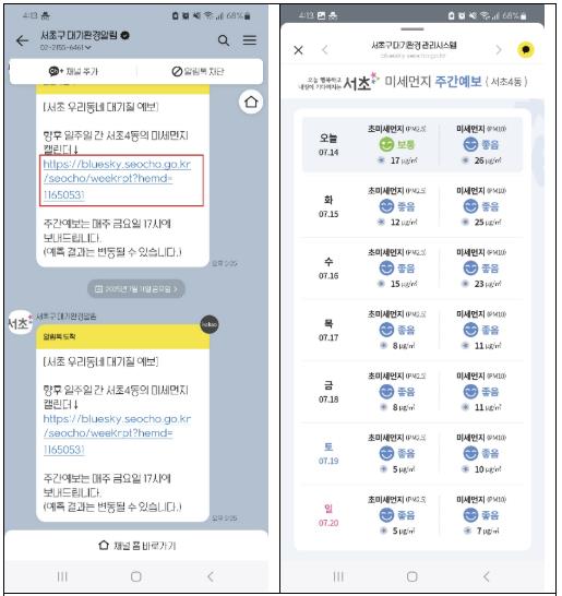 서울 서초구는 주민들의 건강을 보호하고 안전한 야외활동을 돕기 위해 8월부터 전 주민을 대상으로 ‘우리동네 대기질 알림 서비스’를 본격 추진한다고 밝혔다.‘우리동네 대기질 알림 서비스’는 내 집 앞, 출근길, 우리 아이 학교 등 생활 밀접한 곳의 미세먼지 등 공기질 정보를 카카오톡 알림을 통해 알려주는 서비스다. 지역 내 108개 장소에 있는 대기질 측정 센서를 통해 ‘국소 지역’의 환경 데이터를 알 수 있는 것이 특징이다.알림을 신청하면 매주 대기질 주간예보와 함께 미세먼지‧초미세먼지가 나쁨일 때 알림을 보내준다. 대기질 측정 센서를 통해 10분 단위로 수집한 환경 데이터에 인공지능 분석 모델을 적용해 오염 수준을 사전에 제공하는 것이다. 주민들은 이를 통해 야외 활동이나 건강관리 계획을 효율적으로 세울 수 있다.앞서 구는 이와 같은 미세먼지 세밀 측정시스템인 ‘통합대기환경 관리시스템’을 2020년부터 운영해 왔다. 덕분에 5년간 수집된 방대한 데이터를 토대로 미세먼지(PM10), 초미세먼지(PM2.5), 오존(O₃) 등 주요 대기오염물질의 특성을 분석해 시간대별‧지역별로 정밀한 예측이 가능해졌다.구는 지난해 어린이집과 대형 비산먼지 발생 공사장을 대상으로 ‘우리동네 대기질 사전 예보 서비스’를 시범 운영해 큰 호응을 얻은 바 있다. 올해부터는 이 서비스를 전체 주민으로 확대해 누구나 대기 정보를 손쉽게 확인하고 대기질 악화에 맞춰 즉각적으로 행동할 수 있도록 했다. 또, 여름철 증가하는 오존 오염에 대응하기 위해 오존주의보 실시간 발령 및 해제 알림도 새롭게 도입했다.알림 서비스 신청은 서초구 통합대기환경시스템 홈페이지에서 누구나 가능하다. 특히 미세먼지 등에 취약한 어르신들이 환경정보를 적극 활용하도록 60세 이상 알림 신청자에게는 구립시설, 탄소제로샵 등에서 사용할 수 있는 ‘서초코인’ 5코인의 혜택도 준다.전성수 서초구청장은 “대기질 수치는 생명과 건강을 지키는 중요한 정보”라며, “이번 ‘우리동네 대기질 알림 서비스’를 통해 모든 주민이 언제 어디서나 대기오염 상황을 쉽게 확인하고, 건강을 지키는 행동을 실천할 수 있도록 돕겠다”고 강조했다.