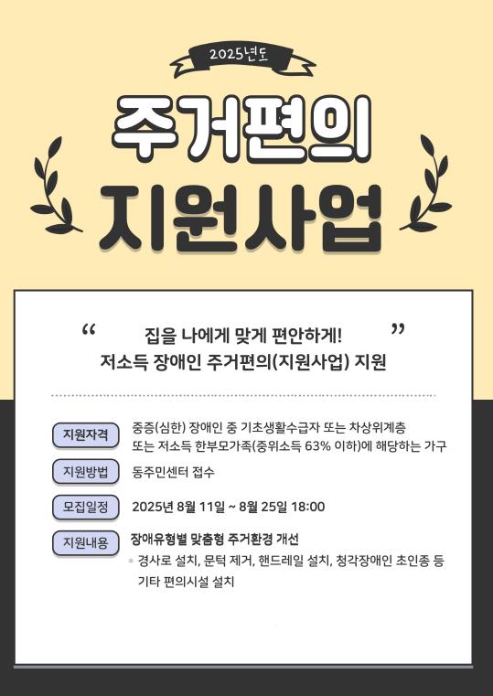 금천구는 장애인 가구의 생활환경을 개선하기 위해 하반기 ‘저소득 장애인 주거편의(집수리) 지원 사업’을 운영한다고 밝혔다.사업은 장애유형별 맞춤형 편의시설 설치 및 개조를 통해 장애인들의 일상생활 불편을 해소하고, 안전하고 쾌적한 주거환경을 조성하기 위해 마련됐다.지원 대상은 중증장애인 중 기초생활수급자, 차상위계층 또는 저소득 한부모가족(중위소득 63% 이하)에 해당하는 가구다. 단, 임대인(소유자)이 공사를 동의하고 1년 이상 거주가 가능해야 한다.지원 항목은 ▲ 화장실 개조 ▲ 문턱 제거 ▲ 경사로 및 핸드레일 설치 등 주거 편의 개선뿐 아니라, ▲ 화재감지기 ▲ 청각장애인 초인종 ▲ 디지털도어락 등 안전시설 설치가 포함된다.지원을 원하는 가구는 25일까지 거주지 동주민센터 또는 금천구청 어르신장애인과로 방문해 신청하면 된다. 소득수준, 거주 환경, 주거 형태 임대 여부, 신청자를 포함한 장애인 수 등 복합적 요소를 고려해 지원 여부가 결정된다.지원이 선정된 가구에는 전문 시공업체가 맞춤형 개조를 진행하며, 장애인 주거환경 개선 전문가들이 자문에 참여해 전문적이고 체계적인 지원이 이뤄질 예정이다.유성훈 금천구청장은 “금천구 내 많은 장애인 가정에서 신청해 편리하고 안전한 공간에서 생활할 수 있기를 바란다”라며, “앞으로도 더 많은 장애인 가구가 안정적인 생활을 누릴 수 있도록 지원을 확대해 나가겠다”라고 말했다.