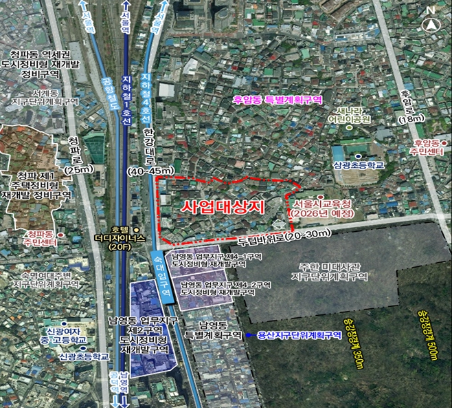 서울시는 2025년 08월 20일 제13차 도시계획위원회를 개최하여 용산구 갈월동 52-6번지 일대에 역세권 장기전세주택 건립을 위한 도시정비형 재개발사업 정비구역 지정 및 정비계획 결정(안)에 대하여 “수정가결” 했다고 밝혔다. 대상지는 4호선 숙대입구역, 용산지구단위계획 후암동 특별계획구역내에 위치하고, 주변에는 산공원 및 남산의 자연 경관이 입지하고 있으며, 남영동 도시정비형 재개발사업 등 다양한 개발사업이 활발히 진행되고 있는 지역으로, 역세권 장기전세주택 도시정비형 재개발사업을 통해 새로운 도시환경을 조성하고자 한다, 정비구역 36,611.5㎡을 신규 지정하고, 공동주택 획지 26,659.5.㎡에 지하4층 ~ 지상40층 규모로 총 870세대(장기전세주택 265세대, 재개발임대주택 59세대 포함)를 건립할 예정이며, 장기전세주택중 50%는 신혼부부를 위한 ‘미리내집’ 으로 향후 공급될 계획이다. 정비계획은 후암동 특별계획구역의 목표 실현과 남산의 도시경관을 고려하여 ‘도심 속 자연경관을 품은 열린 도심형 주거단지 조성’을 목표로 녹지 네트워크, 주거, 도심기능이 어울러진 쾌적하고 편리한 배후 주거지를 조성하는 계획을 수립했다. 주요 내용으로 남산으로의 열린 경관 및 조망을 위해 한강대로변과 두텁바위로변에서 통경축을 최대한 확보하면서 보행가로 활성화를 위한 정비계획을 수립했다. 대상지와 주변 후암특별계획구역과의 보행 연계를 위해 북측 생활중심도로 12m, 동측 두텁바위로변 진입도로 15m를 신설하고 주변에 공공공지를 1,164㎡ 조성하여 주민들을 위한 녹지 공간을 확보했으며, 두텁바위로변 등 구역경계에는 5m~10m 보도형 전면공지를 조성해 가로활성화를 유도했다. 또한, 기존 지역내 사회복지시설은 두텁바위로변과 한강대로변으로 입지가 우수한 곳으로 위치 조정하고 2개의 건물을 신설해 지역 주민들의 생활편익이 향상되도록 공공기여 계획을 수립했다. 서울시 관계자는 “이번 숙대입구역세권(갈월동 52-6번지 일대) 장기전세주택 도시정비형 재개발사업 정비구역 지정 및 정비계획 수립은 후암특별계획구역과 경관이 우수한 남산과 용산공원 주변에 최초의 역세권 장기전세주택 개발사업으로 시민들에게 생활편익과 양질의 장기전세주택을 공급할 수 있을 것으로 기대된다.”고 밝혔다.