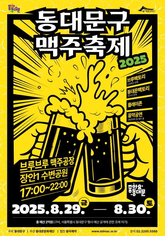 동대문문화재단은 8월 29일부터 30일까지 이틀간 장안1수변공원에서 ‘2025 동대문구 맥주축제’를 개최한다. 메인무대, 먹거리존, 게임 이벤트존·무비존 등으로 구성돼 풍성한 볼거리와 즐길 거리를 선보인다.메인무대는 29일 퓨전국악밴드 ‘온도(OWNDO)’와 재즈스텝빌리지의 무대로 축제의 막을 올린다. 이어 30일에는 정통 재즈를 들려줄 ‘한석규 트리오’, 영화·팝 OST를 스윙으로 풀어낼 ‘하야 퀄텟’, 재즈와 클래식의 깊이를 담은 ‘권예성 밴드’, 감성적인 보사노바를 선보일 ‘혜원 트리오’, 다채로운 무대를 꾸밀 ‘코지재즈 오피스’가 잇따라 공연을 펼친다.먹거리존에는 국내 10개의 유명 수제맥주 브루어리가 참여해 다양한 맥주를 선보인다. 속초 ‘크래프트루트’, 통영 ‘라인도이치’, 가평 ‘크래머리’ 등 지역을 대표하는 브루어리들이 함께하며, 김치말이국수·터키 아이스크림 등 인기 푸드트럭 메뉴도 즐길 수 있다. 특히 동대문구전통상인연합회와 협력해 홍어, 떡갈비 등 판매 부스도 운영돼 상생의 의미를 더한다.게임 이벤트존과 무비존에서는 관람객을 위한 다양한 체험이 마련된다. 무비존에서는 29일 답십리영화미디어아트센터와 협력해 ‘달빛 아래, 영화 피크닉’ 사업의 일환으로 영화 `로봇드림(Robot Dreams, 2023)`이 상영된다. 대사가 없는 애니메이션으로 남녀노소 누구나 즐길 수 있으며, 야외 상영 환경에서도 높은 몰입도를 기대할 수 있다.게임 이벤트존에서는 세계 다트 문화 선도 기업인 피닉스다트의 협찬으로 전자 다트 체험공간이 운영된다. 축제장에서 구매한 영수증을 지참하면 누구나 참여할 수 있어 관람객들에게 색다른 즐거움을 제공한다.또한 동대문구 소재 기업 동아제약이 협찬사로 참여해 ‘모닝케어’ 젤리스틱을 제공, 현장 이벤트에 활용할 예정이다. 세부 프로그램과 최신 소식은 동대문구 맥주축제 공식 인스타그램을 통해 확인할 수 있다.김홍남 동대문문화재단 대표이사는 “이번 축제를 통해 지역 주민은 물론 방문객 모두가 문화와 여가를 함께 즐기고, 세대와 지역을 아우르는 어울림의 장이 되길 바란다.”라고 말했다.