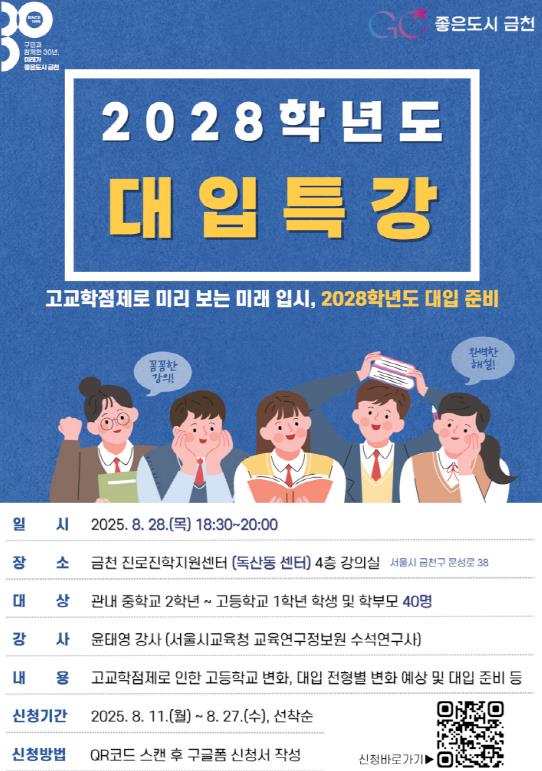 금천구는 오는 28일 오후 6시 30분 금천 진로진학지원센터에서 변화하는 교육과정과 입시 제도로 혼란을 겪고 있는 학생·학부모를 위해 ‘2028학년도 대입 특강’을 개최한다고 밝혔다.고교학점제 전면 시행과 함께 변화가 예상되는 2028학년도 대입 제도에 선제적으로 대응하고, 학생·학부모 맞춤형 준비 전략을 제공하기 위해 마련된 자리다. 중학교 2학년부터 고등학교 1학년 학생과 학부모가 대상이다.서울특별시교육청 교육연구정보원 소속 진학담당 교육연구사인 윤태영 연구사가 초청돼 ‘고교학점제로 미리보는 미래 입시, 2028학년도 대입 준비’를 주제로 특강을 진행할 예정이다.▲고교학점제로 인한 고등학교 변화 ▲고등학교 유형별 교육과정 특징 ▲대입 전형별 변화 전망 ▲고교학점제 체제에서의 대입 준비 전략 등을 강의한다.윤태영 연구사는 다년간 고등학교 진학담당 교사로 활동한 진로·진학 분야 전문가다. 현장 경험과 전문성을 바탕으로 학생과 학부모가 궁금해하는 내용을 구체적으로 안내할 것이라고 구는 설명했다.특강에 관심 있는 학생이나 학부모는 27일까지 구글폼이나 포스터의 QR코드를 통해 신청하면 된다. 온라인 신청을 못한 경우 행사 당일 현장 신청도 가능하다.유성훈 금천구청장은 ˝빠르게 변화하는 입시 환경 속에서 학부모님들과 학생들이 한발 앞서 준비할 수 있도록 이번 특강을 마련했다˝라며, ˝학생 한 명 한 명의 목표에 도움이 되는 시간이 되기를 바란다˝라고 말했다.