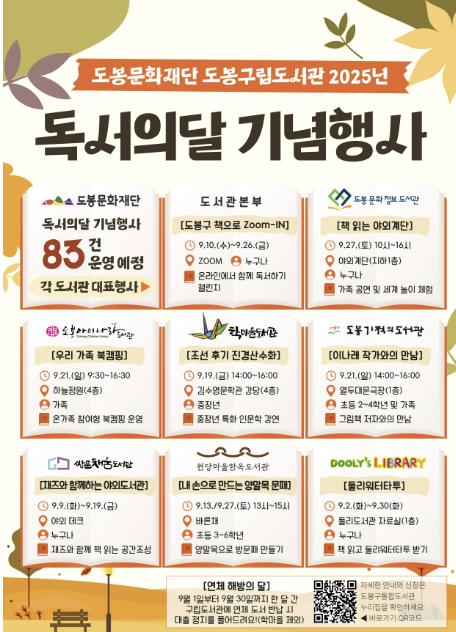 서울 도봉구 도봉문화재단 소속 7개 도봉구립도서관이 9월 ‘독서의 달’을 맞아 총 83개의 독서 문화행사를 마련했다.‘독서의 달’은 독서문화진흥법에 따라 국민의 독서 의욕을 높이고 독서 생활화를 장려하기 위해 정한 기간이다.9월 한 달간 7개 도봉구립도서관은 야외도서관 운영을 비롯해 전시, 공연 등 다채로운 프로그램을 운영한다.야외도서관으로는 ▲쌍문채움도서관 ‘재즈와 함께 하는 야외도서관’(9.9.~9.19.) ▲도봉아이나라도서관 ‘우리 가족 북캠핑’(9.21.) ▲도봉문화정보도서관 ‘책 읽는 야외계단’(9.27.) 등이 진행된다.도서관별 특화프로그램으로는 ▲학마을도서관 ‘조선 후기 진경산수화’(9.19.) ▲도봉기적의도서관 ‘이나래 작가와의 만남’(9.21.) ▲원당마을한옥도서관 ‘내 손으로 만드는 양말목 문패’(9.13., 9.27.) ▲둘리도서관 ‘둘리워터타투’(9.2.~9.30.)가 운영된다.이 밖에도 모든 도서관이 연체 도서 반납 시 대출 정지를 풀어주는 ‘연체 해방의 달(9.1.~9.30.)’과 온라인 독서 챌린지 ‘도봉구 책으로 Zoom-IN(9.1.~9.30.)’이 진행된다.오언석 도봉구청장은 “9월 독서의 달, 도봉구립도서관이 마련한 프로그램으로 알차게 보내시길 바란다.”라고 말했다.
