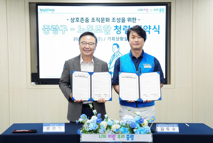 중랑구는 8월 22일 중랑구노동조합과 함께 ‘청렴, 같이 말해요’ 협약을 체결하고, 직원 대표들과 자유로운 분위기 속 간담회를 진행했다. 이번 행사는 조직 내 청렴 문화 확산과 공정한 행정 구현을 위한 실질적인 개선과제를 찾기 위해 마련됐다. 이날 행사는 송판 격파를 시작으로 청렴 실천을 위한 협약 체결과 자유토론 형식의 간담회, 퍼즐을 함께 맞추는 ‘청렴·조직 화합 퍼포먼스’ 순으로 진행됐다. 협약서에는 ▲상호존중과 배려 ▲건강한 조직문화를 위한 소통 ▲청렴·공정 문화 확립 등의 내용이 담겼으며, 이행 사항은 정기적으로 점검하고 필요 시 보완해 나갈 계획이다. 류경기 중랑구청장은 “서로의 생각을 편안하게 나누며 조직의 청렴 문화를 함께 만들어 가는 뜻깊은 시간이었다”며 “노조와 협력해 오늘의 약속이 단순한 선언에 그치지 않고, 일상 속 실천으로 이어질 수 있도록 적극 노력하겠다”고 말했다.