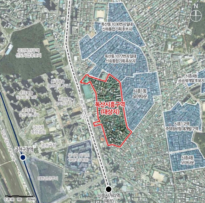 금천구는 8월 21일 ‘독산시흥구역 주택정비형 재개발사업’의 사업시행자로 ‘한국투자부동산신탁 주식회사’를 지정 고시했다. 사업시행자 지정은 지난 1월 정비구역 지정 고시 후 약 7개월 만으로, 신속통합기획 2차에 선정된 25개 사업지 중 두 번째다. 조합방식에 의한 정비사업의 경우 정비구역 지정 이후 조합 설립 시까지 2년 이상 소요되는 경우가 많지만, 독산시흥구역은 신탁방식으로 진행돼 추진 기간이 상당히 단축됐다. 독산시흥구역은 2022년 12월 서울시 신속통합기획 2차에 후보지로 선정된 노후 저층 주거지로, 면적 약 8만8천㎡에 최고 45층, 16개동, 2072세대 규모의 아파트가 들어설 예정이다. 해당 구역은 1호선 금천구청역과 개통 예정인 신안산선 시흥사거리역을 함께 이용할 수 있는 위치다. 또한, 시흥대로 동측으로 독산시흥구역과 인접하여 독산동 1036번지 일대 및 1072번지 재개발, 모아타운 등이 추진되고 있어 향후 미니신도시 급의 주거단지 조성이 예상된다. 앞서 추진준비위원회는 신속한 사업 추진을 위해 주민설명회, 설문조사 등을 거쳐 지난 5월 14일 한국투자부동산신탁을 예비 신탁사로 선정했다. 신탁업자는 5월 말부터 동의서 징구를 시작해 ‘도시 및 주거환경정비법’ 제27조에 따른 토지등소유자 동의(토지등소유자 75% 이상, 토지면적 50% 이상)를 얻어, 지난 7월 1일 사업시행자 지정을 신청했다. 구는 서류 검토와 4차례 보완 과정을 거쳐 최종 동의율 76.2%, 동의면적 72.71%를 확인하고, 한국투자부동산신탁을 사업시행자로 지정·고시했다. 유성훈 금천구청장은 “주민과 구청이 협력하여 사업시행자 지정이 조속히 완료된 만큼 사업이 원만하게 진행될 수 있도록 적극적으로 지원할 예정이다.”라며, “앞으로도 재개발 등 정비사업을 통해 도시 활력을 높이고, 주민들의 주거환경을 개선하겠다”라고 말했다. 한편, 구는 주민들의 혼란을 방지하고, 사업방식 선택에 도움을 주고자 서울시와 협력해 ‘찾아가는 정비사업 주민학교’를 개최해 사업 시행방식에 대한 설명을 진행한 바 있다. 자세한 사항은 금천구청 주거정비과로 문의하면 안내받을 수 있다.