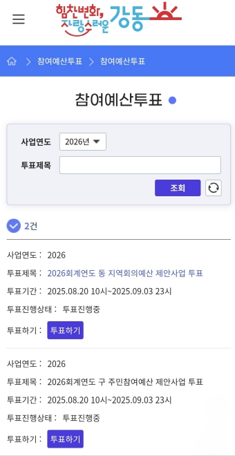 강동구는 내년도 20억 원 규모의 주민참여예산 사업 선정을 위해 오는 9월 3일까지 온라인 투표를 진행한다고 25일 밝혔다. 주민참여예산제는 주민이 필요한 생활 밀착형 사업을 직접 제안하고, 투표와 심의를 거쳐 우선순위에 따라 예산에 반영하는 제도다. 구는 재정 운영의 투명성과 주민 참여 민주주의를 강화하기 위해 주민참여예산제를 운영하고 있으며, 총 20억 원 규모로 편성을 앞두고 있다. 이는 서울시 자치구 중에는 두 번째로 많은 규모다. 이번 투표 대상 사업은 총 43건이다. 구민들은 이 가운데 구 단위 주민참여예산 사업에서 4개, 그리고 동 지역회의 예산 사업에서 4개를 각각 선택해 총 8개의 사업에 투표할 수 있다. 특히, 올해부터는 행정안전부의 ‘주민e참여 시스템’ 누리집에서 모바일 투표가 가능해졌다. 구민들은 컴퓨터나 스마트폰을 활용해 별도의 회원가입 절차 없이 간편하게 투표에 참여할 수 있다. 사업의 최종 선정은 이번 모바일 투표 결과와 함께 주민참여예산위원회 총회에서 진행되는 현장 투표 결과를 합산해 확정된다. 최준식 기획예산과장은 “주민참여예산은 구민의 선택으로 지역의 미래를 함께 만들어가는 제도인 만큼, 더 많은 주민들이 투표에 참여해 주실수록 의미 있는 결과가 나온다”라며, “구민 여러분의 소중한 한 표 한 표가 내년 예산에 반영되는 만큼 적극적인 참여를 부탁드린다”라고 말했다.