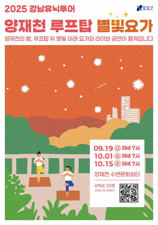 꿈이 모이는 도시, 미래를 그리는 강남구가 주민과 관광객에게 특별한 체험을 선사하는 ‘강남유닉투어 별빛요가’를 오는 8월 28일부터 삼성해맞이공원에서 재개하고, 9월부터는 양재천 수변 문화쉼터 옥상에서도 새롭게 선보인다.‘강남유닉투어 별빛요가’는 전문 강사의 요가·필라테스 수업과 재즈·클래식·올드팝 등 다채로운 장르의 라이브 공연을 한자리에서 즐길 수 있는 체험형 관광 프로그램이다. 아름다운 야경 속에서 진행되는 이 프로그램은 국내외 관광객과 주민들에게 강남의 대표 체험 코스로 자리 잡았으며, 매회 참가자들의 높은 호응을 얻고 있다.올해는 9월 개관하는 양재천 수변 문화쉼터 옥상에서 ‘옥상 별빛요가’를 신설해 참여 기회를 넓힌다. 이곳에서는 9월 19일, 10월 1일, 10월 15일 저녁 7시에 총 3회 운영되며, 잔잔한 수변 경관과 함께 도심 속 이색적인 야간 프로그램을 경험할 수 있다. 기존 삼성해맞이공원 별빛요가는 8월 28일부터 9월까지 매주 목요일 저녁 7시에 진행한다.강남유닉투어는 연령 제한 없이 누구나 참여할 수 있으며, 예약과 일정 등 자세한 정보는 강남구 공식 관광 홈페이지 ‘비짓강남’(VISIT GANGNAM) 에서 확인 가능하다.조성명 강남구청장은 “강남유닉투어는 세계적인 관광 도시 강남에서 자연과 문화를 동시에 즐길 수 있는 특별한 기회”라며 “앞으로도 강남의 색다른 매력과 트렌드를 반영한 콘텐츠를 지속적으로 발굴해 나가겠다”고 말했다.