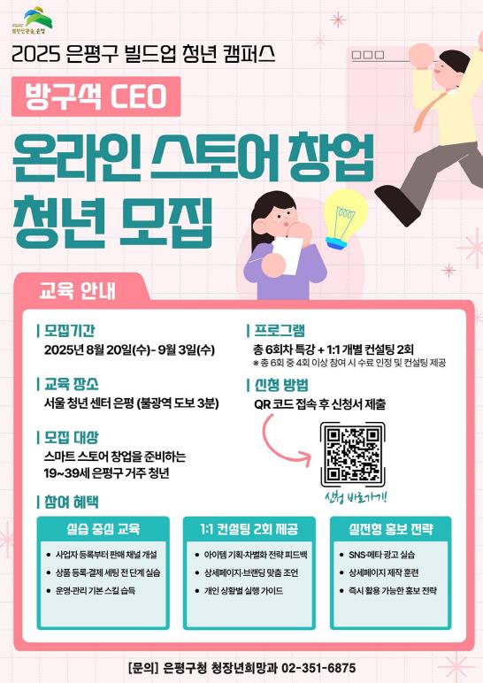 서울 은평구는 온라인 스마트스토어 창업을 준비하고 있는 청년을 위한 ‘방구석 CEO’ 프로그램 참여자를 내달 3일까지 모집한다고 밝혔다.이번 프로그램은 ‘빌드업 청년 캠퍼스’의 세 번째 과정으로 기획됐다. ‘빌드업 청년 캠퍼스’는 청년들의 실질적인 구직 역량 강화를 목표로 ▲이직 준비 ▲첫 구직 준비 ▲창업 준비 등 청년의 다양한 구직 유형별 수요를 충족하기 위한 커리큘럼을 제공하고 있다.창업 준비 코스 ‘방구석 CEO’ 프로그램에서는 사전 설문조사에서 가장 선호하는 1인 창업 분야 중 온라인 스마트스토어 창업에 대한 실습 중심 교육을 한다. 특히 오프라인 특강과 함께 전문 강사의 1:1 개인별 맞춤 피드백을 제공할 예정이다.또한 청년들이 창업을 준비하며 생길 수 있는 다양한 고민을 밀착 피드백해 6주 안에 실제 판매 가능한 스마트스토어 완성을 목표로 진행된다. 청년들은 브랜드 방향성 설정과 아이디어 발굴 과정에서부터 스마트스토어 개설 실습, 홍보 콘텐츠 제작에 이르기까지의 과정을 전문 강사에게서 배울 수 있다.모집은 온라인 스마트스토어 창업을 희망하는 19세~39세 청년을 대상으로 진행되며, 은평구에 거주하는 청년을 우선으로 15명 선정한다. 신청을 희망하면 포스터에 있는 큐알(QR)코드를 통해 접수하면 된다. 프로그램은 내달 10일부터 주 1회 진행된다.김미경 은평구청장은 “이번 ‘방구석 CEO’ 프로그램은 창업을 꿈꾸는 청년들이 한 번의 커리큘럼을 통해 온라인 스토어 사장님으로 거듭날 수 있는 발판이 될 것으로 기대한다”며 “은평구는 앞으로도 청년들이 구직 방향을 고민하는 단계에서 사회의 주체로 성장해 나갈 수 있도록 아낌없이 지원을 이어 나가겠다”고 말했다.