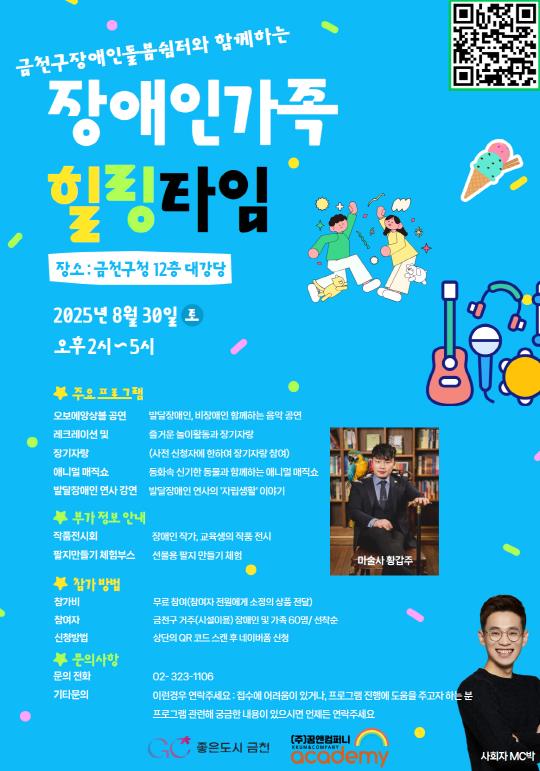 금천구는 오는 30일 오후 2시부터 5시까지 금천구청 12층 대강당에서 금천구장애인돌봄쉼터와 함께하는 행사 ‘장애인가족 힐링타임’을 연다고 밝혔다.관내 장애인과 장애인 가족들을 위해 마련된 이번 행사는 문화예술을 누릴 기회가 적은 장애인과 그 가족들에게, 힐링의 기회를 제공하며 쉼과 회복을 선사할 것으로 기대된다.이번 행사를 통해 발달장애인과 비장애인으로 구성된 오보에앙상블 공연을 즐길 수 있다. 아울러 레크리에이션과 장기자랑, 발달장애인 연사의 자립생활 이야기, 마술사 황갑주의 애니멀 매직쇼 등 장애인과 그 가족들이 즐겁게 참여할 수 있는 다양한 프로그램도 준비됐다.이와 함께 장애인 작가‧교육생의 작품을 전시하고 선물용 팔지 만들기 체험부스도 운영할 것이라고 구는 밝혔다.행사 참석을 원하면 홍보 포스터의 QR코드를 이용해 인터넷으로 신청할 수 있다. 구는 관내 장애인과 그 가족 중 60명을 모집할 예정이다. 참석자는 선착순 모집이다.유성훈 금천구청장은 “이번 행사가 장애인과 그 가족들에게 쉼을 제공할 수 있는 좋은 추억이 되길 바란다”라며 “앞으로도 장애인 삶의 질 향상을 위해 다양한 프로그램을 지속적으로 지원하고 운영해 나갈 계획”이라고 밝혔다.