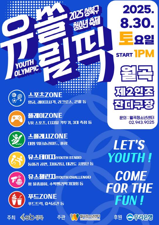 서울 성북구 대표 청소년 축제 ‘유쏠림픽(YOUTH OLYMPIC)’이 오는 2025년 8월 30일 오후 1시부터 월곡제2인조잔디구장에서 열린다. 이번 축제는 청소년들이 주체가 되어 직접 기획·운영하는 참여형 행사로, 스포츠의 역동성과 여름 워터 페스티벌의 시원함을 결합한 성북구만의 독창적인 축제다.축제는 대한민국 1호 아동 친화도시 성북구의 취지에 맞춰 기획됐다. ‘놀 권리 보장, 신체 및 심리적 안정감 증진, 함께 즐기는 청소년 문화’라는 주제로, 바쁜 학업과 일상에서 벗어나 청소년들이 또래와 어울리며 건강한 에너지를 나눌 수 있는 장을 마련하는 데 의의가 있다. 다양한 체험과 공연이 어우러진 종합 문화축제로 의미가 크다.행사장은 다섯 개의 존(zone)으로 나뉘어 운영된다. 스포츠존에서는 양궁, 레이저 사격, 콘홀 등 올림픽을 연상시키는 체험형 스포츠 프로그램이 마련된다. 플레이존에서는 VR 스포츠 게임, 디지털 격투기, 3대 체력 측정 등 최신 트렌드를 반영한 활동이 진행된다. 스플래시존은 대형 워터슬라이드, 풀장, 살수차 퍼포먼스 등 여름철에만 즐길 수 있는 물놀이 공간으로 꾸며진다. 유스 스테이지에서는 치어리딩, 태권도 시범, 밴드와 댄스 공연 등 청소년 동아리들이 직접 무대를 꾸미며, 유스 챌린지에서는 왕 지키기 물총 싸움, 수박 빨리 먹기 대회 등 흥미로운 이벤트가 준비된다.현장에는 푸드트럭이 마련돼 먹거리와 휴식 공간도 제공된다. 남녀노소 누구나 참여할 수 있는 개방형 축제로, 지역 주민과 청소년이 함께 어울리는 자리로 진행될 예정이다.이승로 성북구청장은 “유쏠림픽은 청소년 스스로 만들어가는 참여형 축제라는 점에서 특별하다”며 “이번 축제를 통해 성북구 청소년들의 열정과 에너지를 널리 알리고, 성북구의 대표 청소년 축제로 자리매김하길 바란다”고 말했다.
